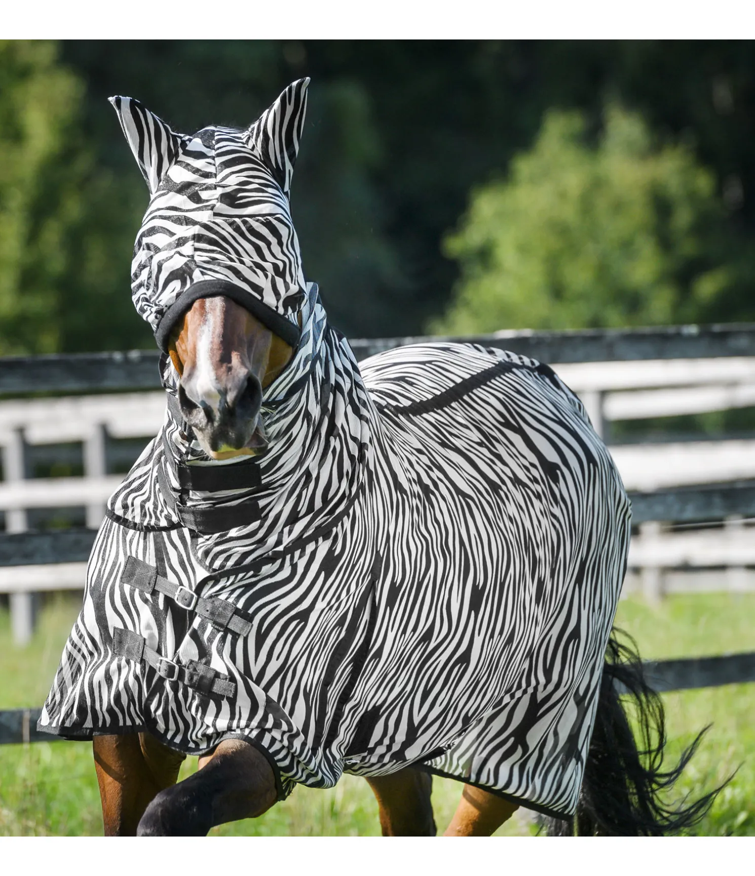 Léger masque anti-mouches à mailles serrées avec imprimé zèbre. Éloigne les insectes de la tête du cheval. Avec bordure polaire extra-douce. 100 % polyester.