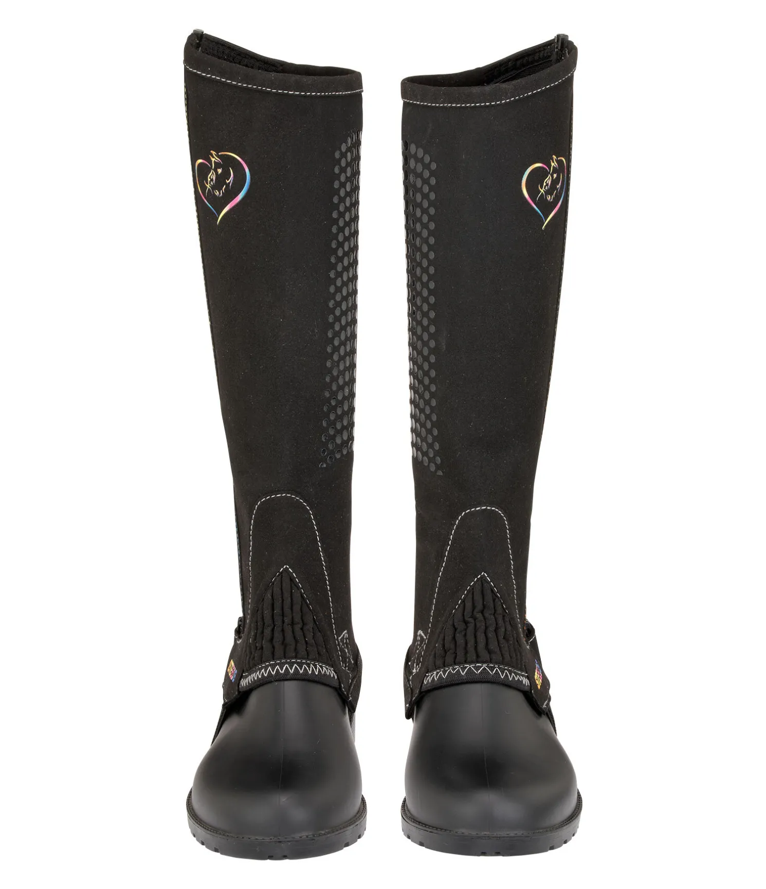 Mini-chaps d’équitation tendances en matière synthétique Amara. Lavables en machine. Logo STEEDS de couleur arc-en-ciel imprimé à l’avant. Empiècements élastiqués pour une adaptation optimale au mollet et à la chaussure. Fermeture à glissière robuste, sécurisée par un bouton-pression pour maintenir le zip fermé. Sous-pied élastiqué et renforcé.