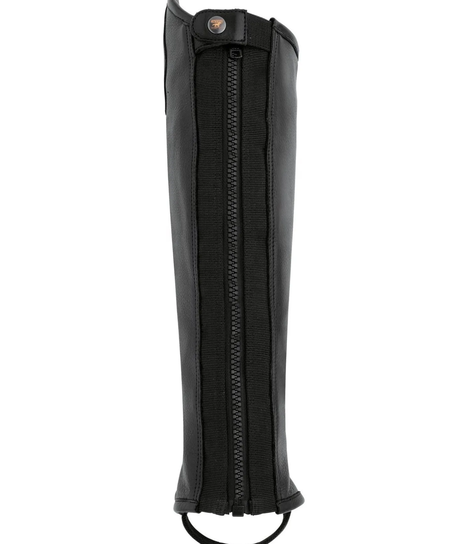 Mini-chaps souples dans un design évoquant des bottes cavalières. Dessus en cuir de vachette naturellement grainé, doux et résistant. Empiècements élastiqués le long de la fermeture à glissière pour un ajustement optimal.