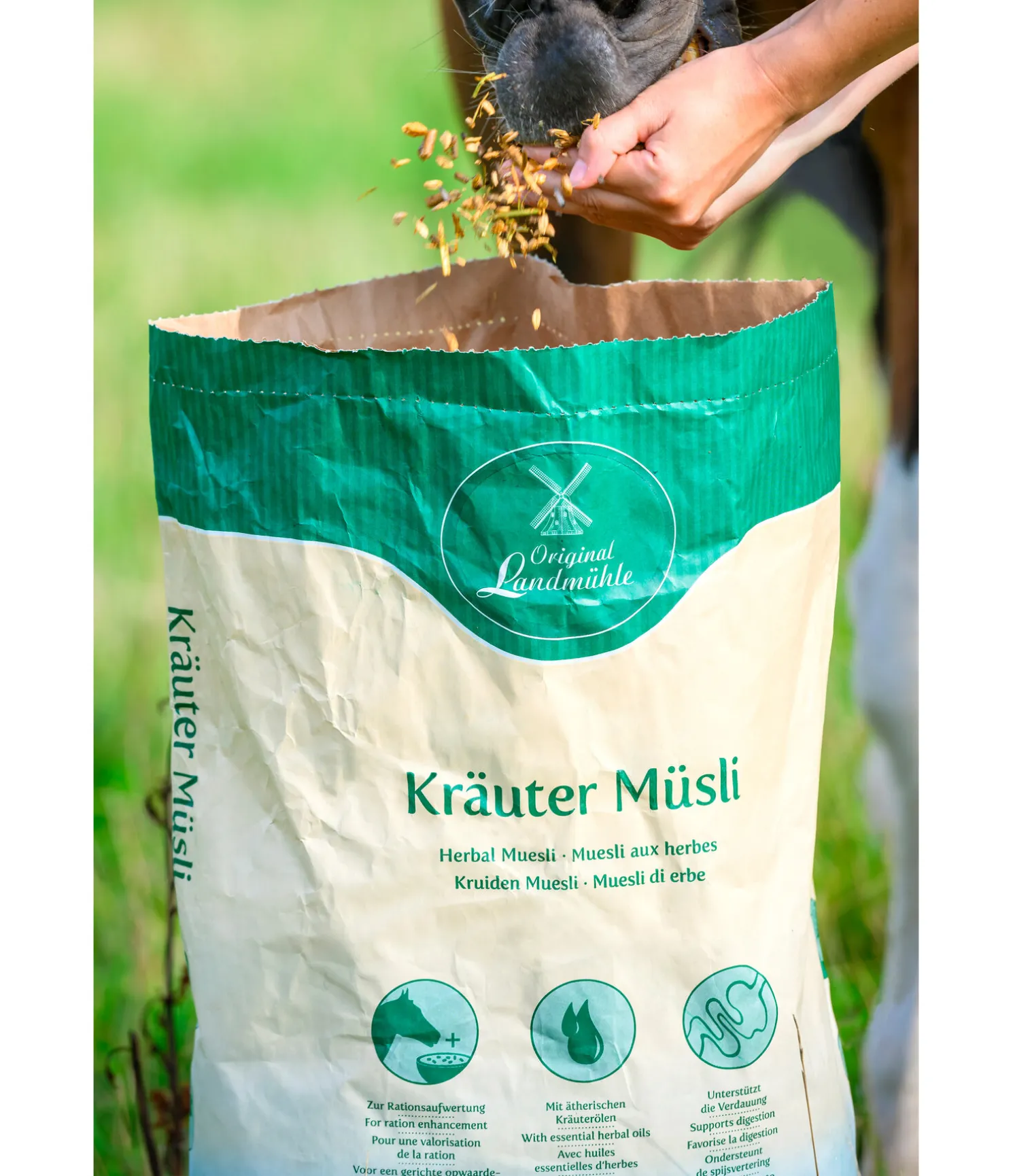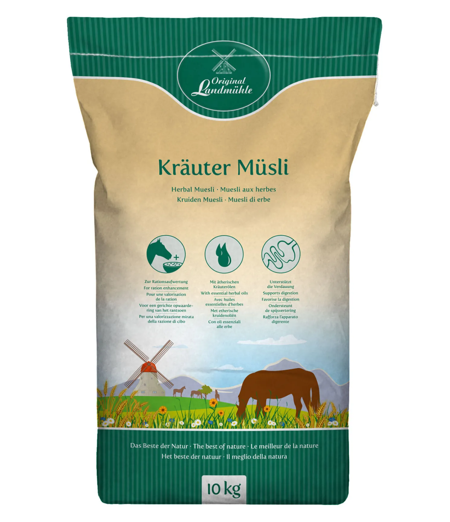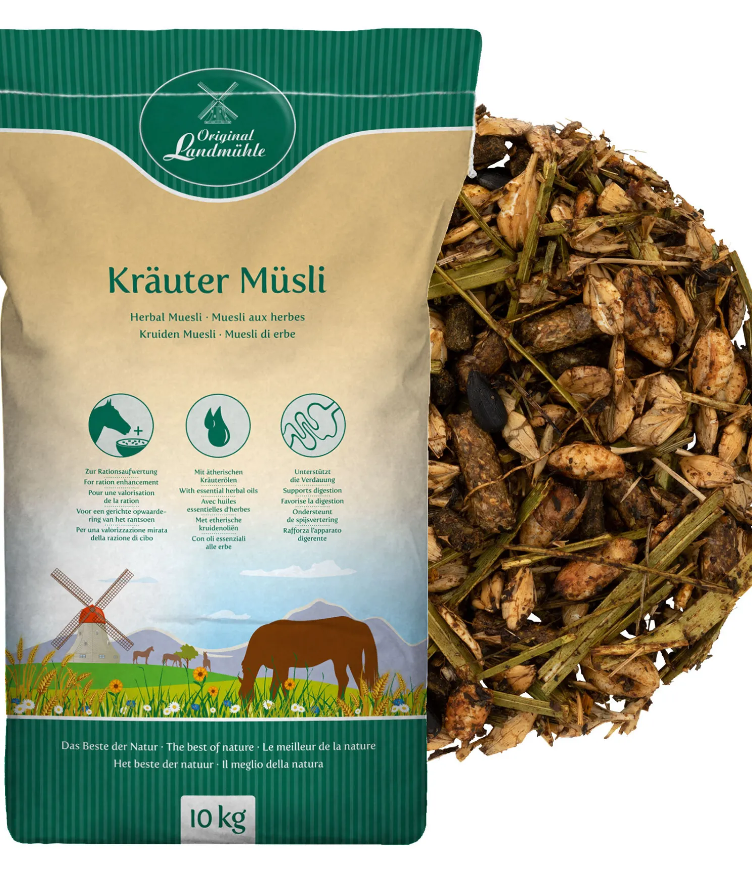 Pour une valorisation optimale de la ration des chevaux de sport et de loisir. Combine la force curative des herbes avec un muesli complet sans avoine, facilement assimilable. La structure exempte de poussière et les herbes spécifiques, combinées aux huiles essentielles contribuent au bien-être et à la santé du cheval. 10 kg.