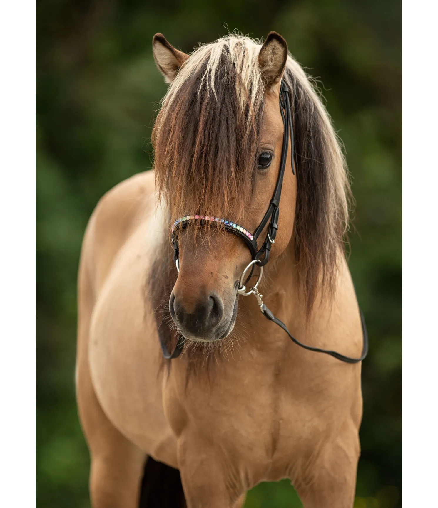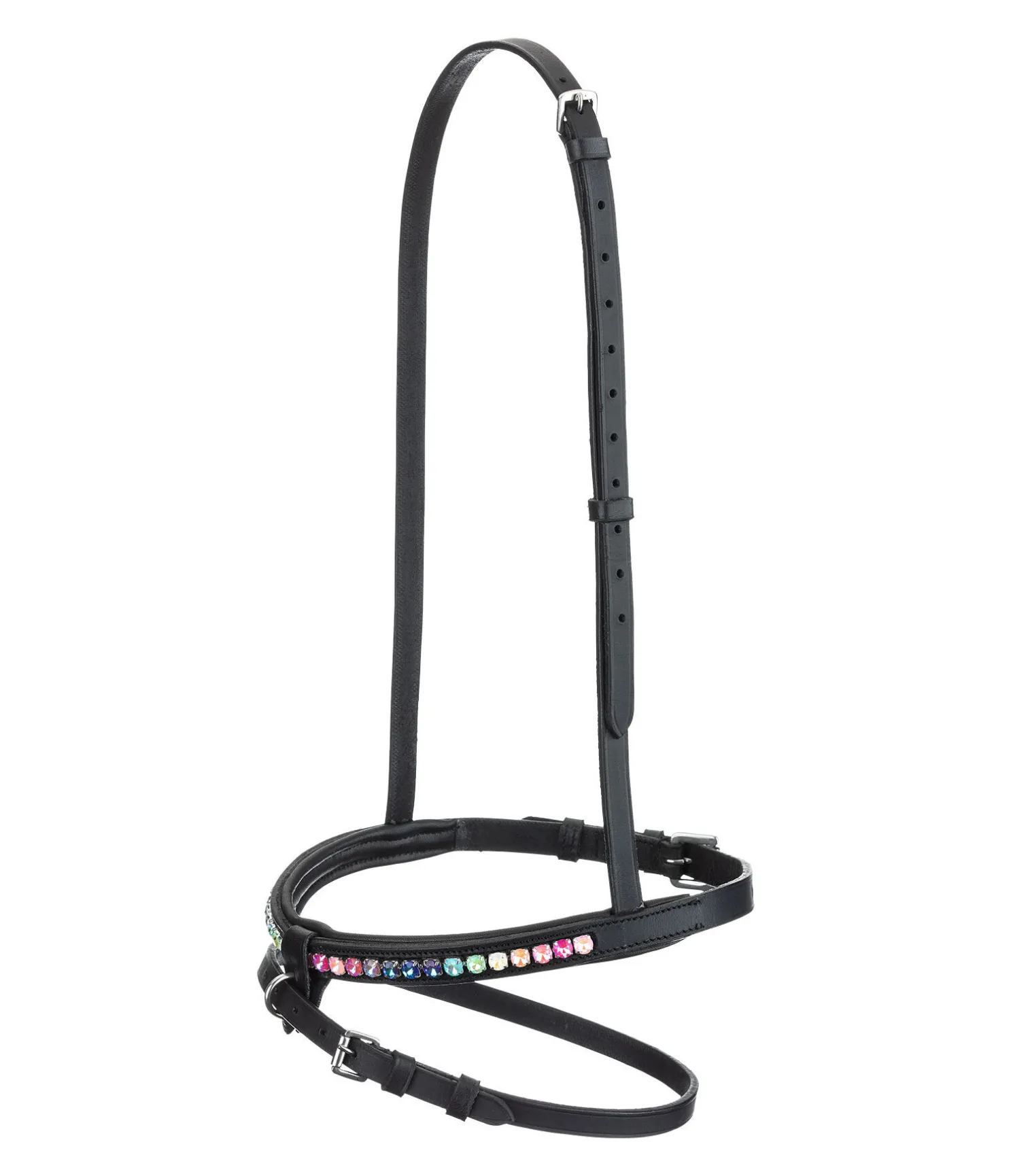 Muserolle islandaise en cuir gras souple avec doublure moelleuse. Ornée d’une rangée de gros strass brillants aux couleurs de l’arc-en-ciel. Noseband fixé à une boucle en cuir et métal amovible. Bouclerie en acier inoxydable.