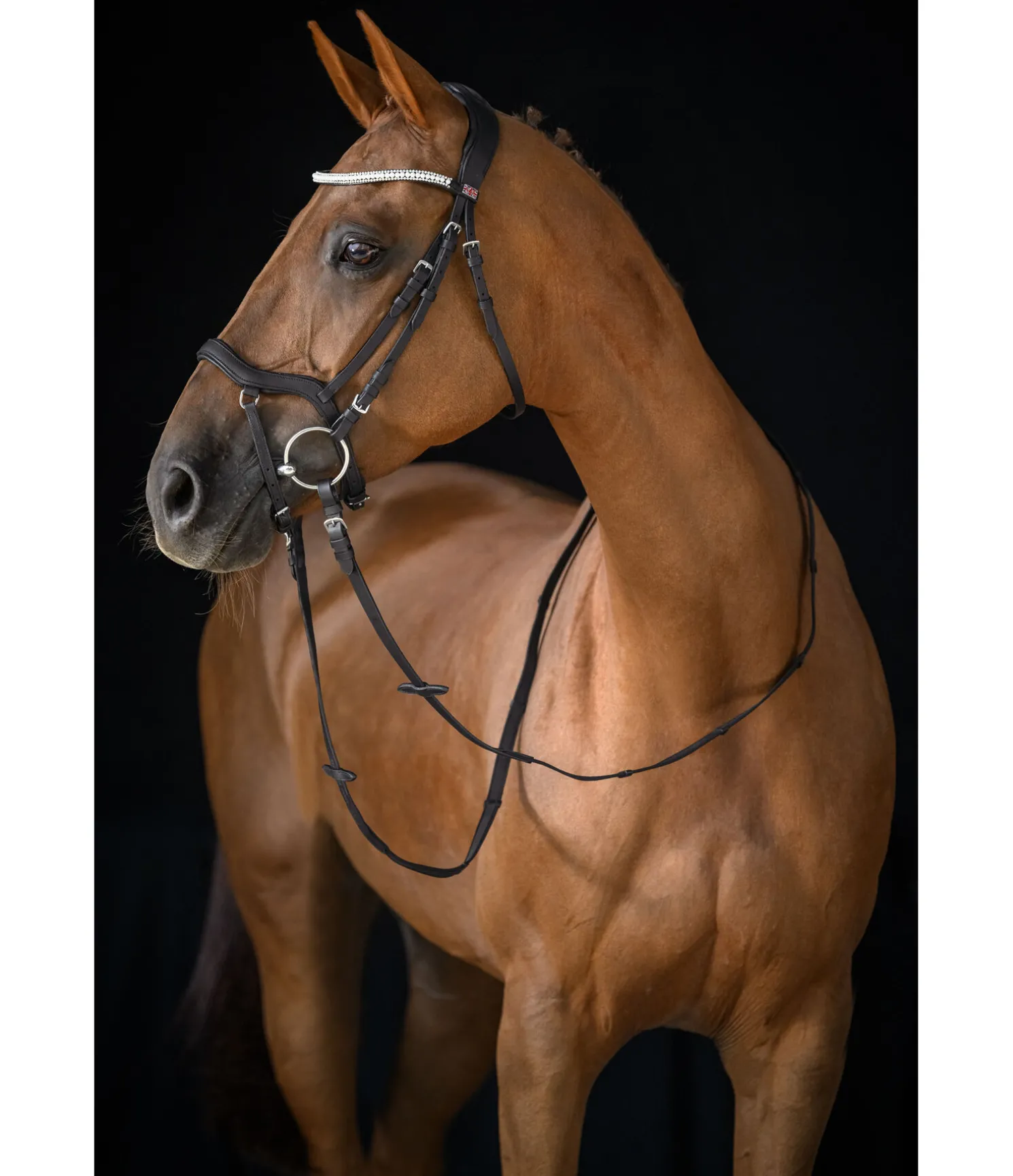 Muserolle combinant les effets d’une muserolle française et d’une muserolle allemande. Les anneaux de fixation latéraux du noseband permettent d’éviter les pressions sur l’os du nez, facilitent la fermeture et offrent davantage de liberté aux naseaux. Pad de menton et muserolle avec doublure épaisse. Cuir gras véritable de qualité, particulièrement souple. Bouclerie argentée. Parfaitement assortie aux autres articles de la série CLARIDGE HOUSE Mix & Match PRO. En combinant les articles de la série CLARIDGE HOUSE Mix & Match PRO, vous pouvez créer le bridon de vos rêves.