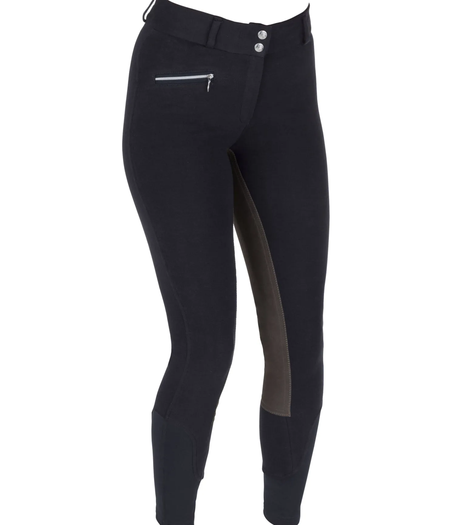 Pantalon d’équitation basique avec fond intégral en synthétique. Matière très extensible et extrêmement douce. 1 poche zippée avant. Large ceinture élastiquée avec 2 boutons. Bas de jambe extensible, sans patte auto-agrippante. 95 % coton, 5 % élasthanne.