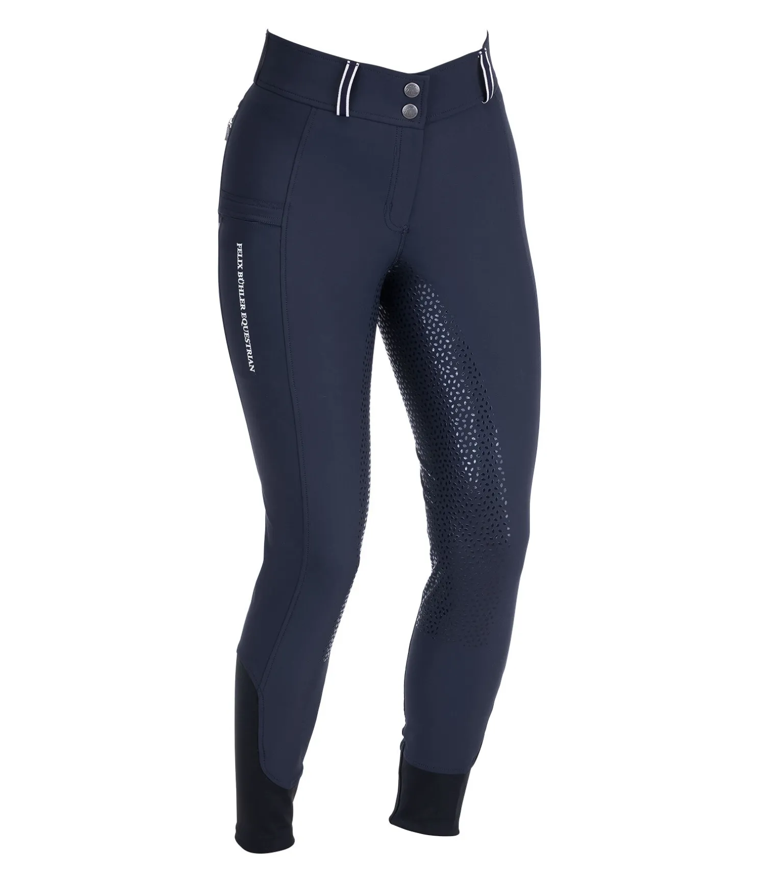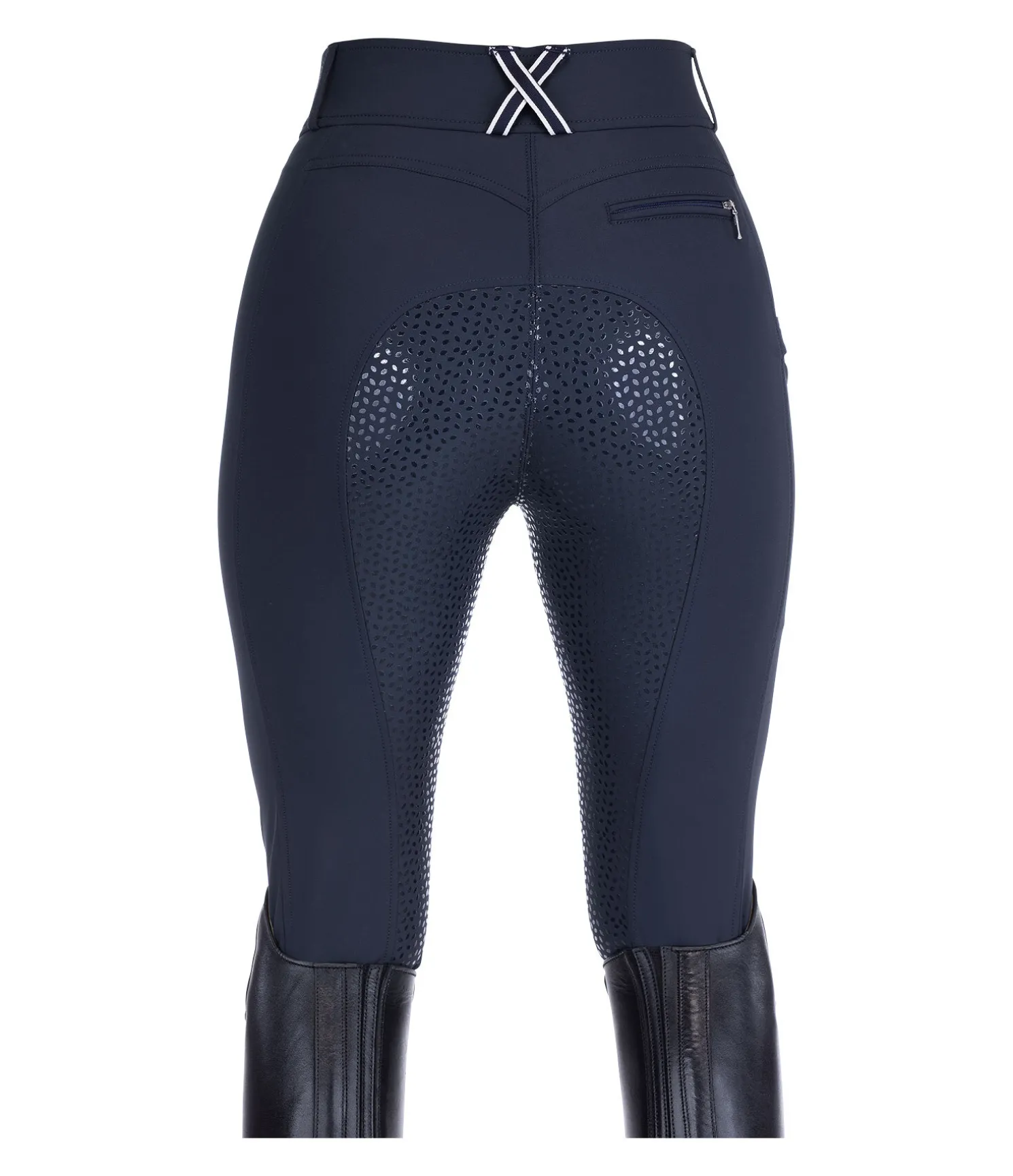 Pantalon d’équitation technique avec fond intégral grip en silicone. Matière déperlante, respirante à séchage rapide. Le tissu stretch offre un super confort et une assise parfaite. 1 poche arrière zippée, 1 poche pour téléphone portable sur la jambe. Ceinture élastiquée avec passants rayés de couleur contrastante. Aucune couture au niveau des genoux. Bas de jambe extensible en stretch. 89 % nylon,11 % élasthanne.