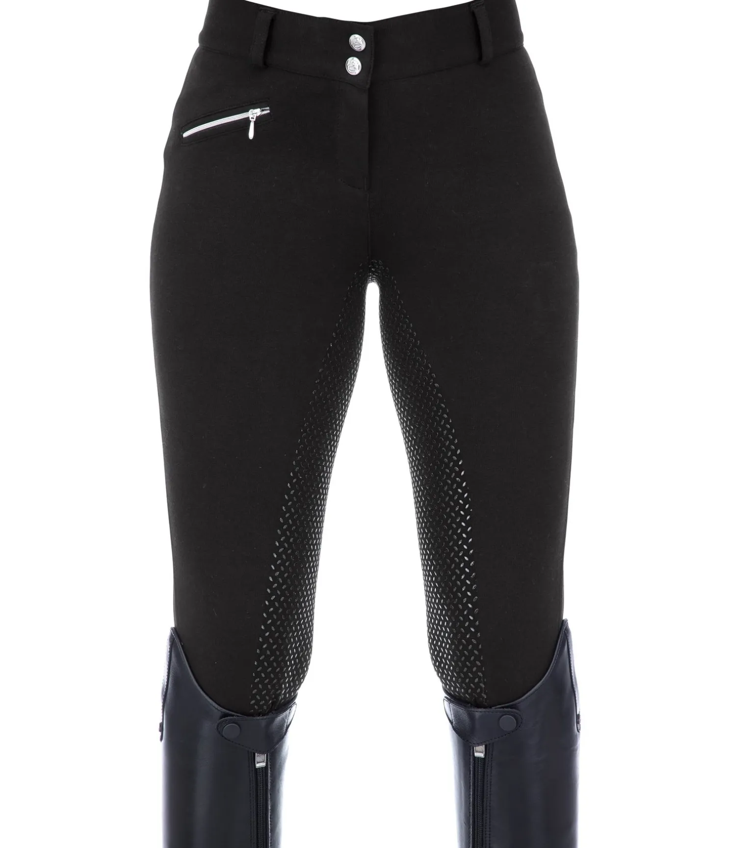 Rapport qualité-prix imbattable ! Pantalon d’équitation confortable. Fond intégral grip en silicone pour une parfaite adhérence en selle. Large ceinture élastiquée. Matière extensible et extra souple. Aucune couture au niveau des genoux. 1 poche avant zippée. Bas de jambe extensible sans patte auto-agrippante. 95 % coton, 5 % élasthanne.