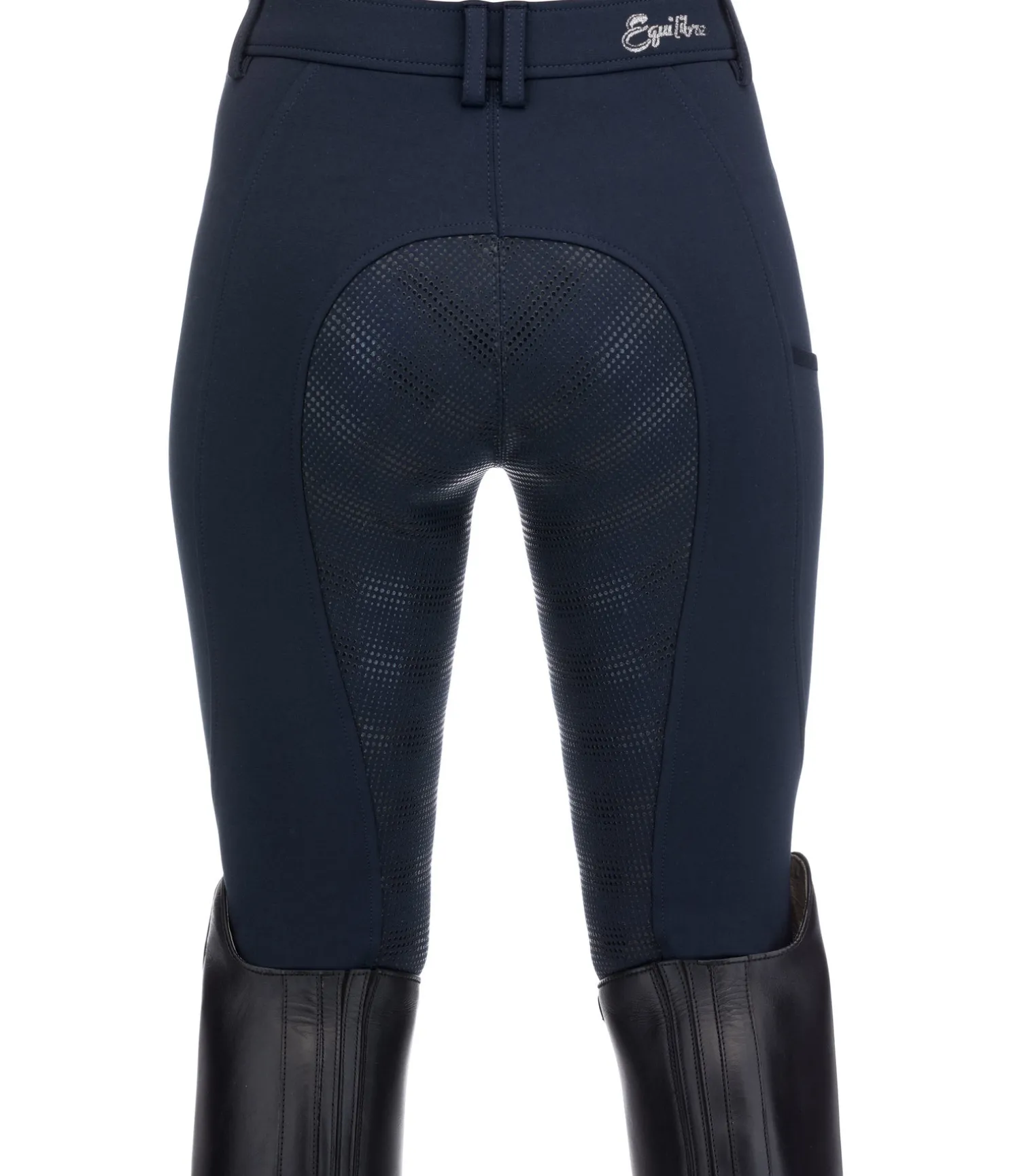 Pantalon d’équitation. Fond intégral grip en silicone. Matière stretch respirante,extensible dans 4 directions et ultra confortable. Poche latérale pour téléphone portable. Bas de jambe extensible sans patte auto-agrippante. 68 % viscose, 27 % polyamide, 5 % élasthanne.
