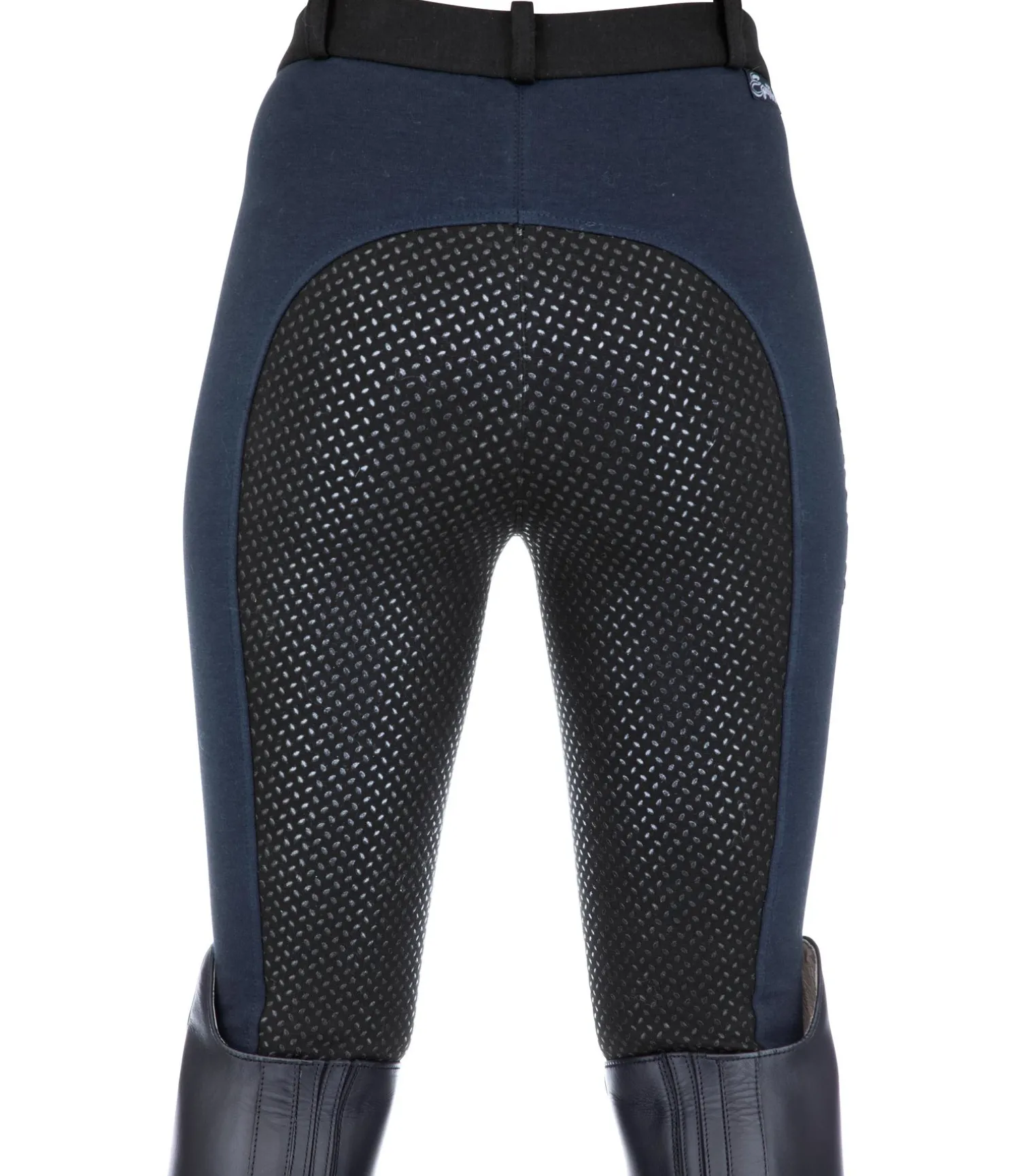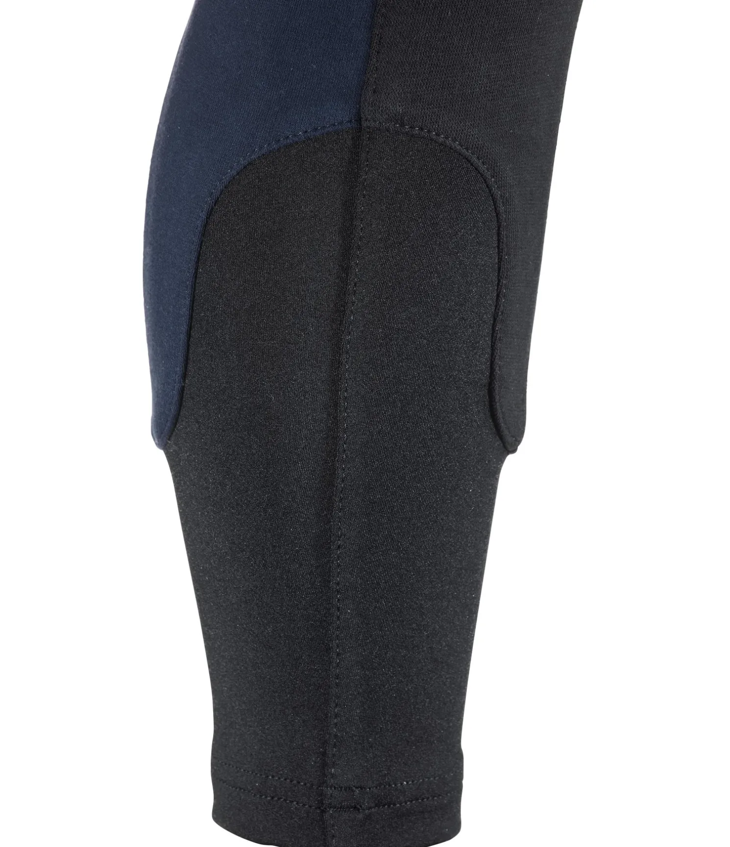 Pantalon d’équitation bicolore. Coton mélangé doux. Fond intégral en silicone idéal pour les cavaliers débutants. Ceinture élastiquée avec passants. Bas de jambe extensible sans patte auto-agrippante pour plus de confort. 1 poche avant zippée. Jolie broderie tendance sur la cuisse droite. 95 % coton, 5 % élasthanne.