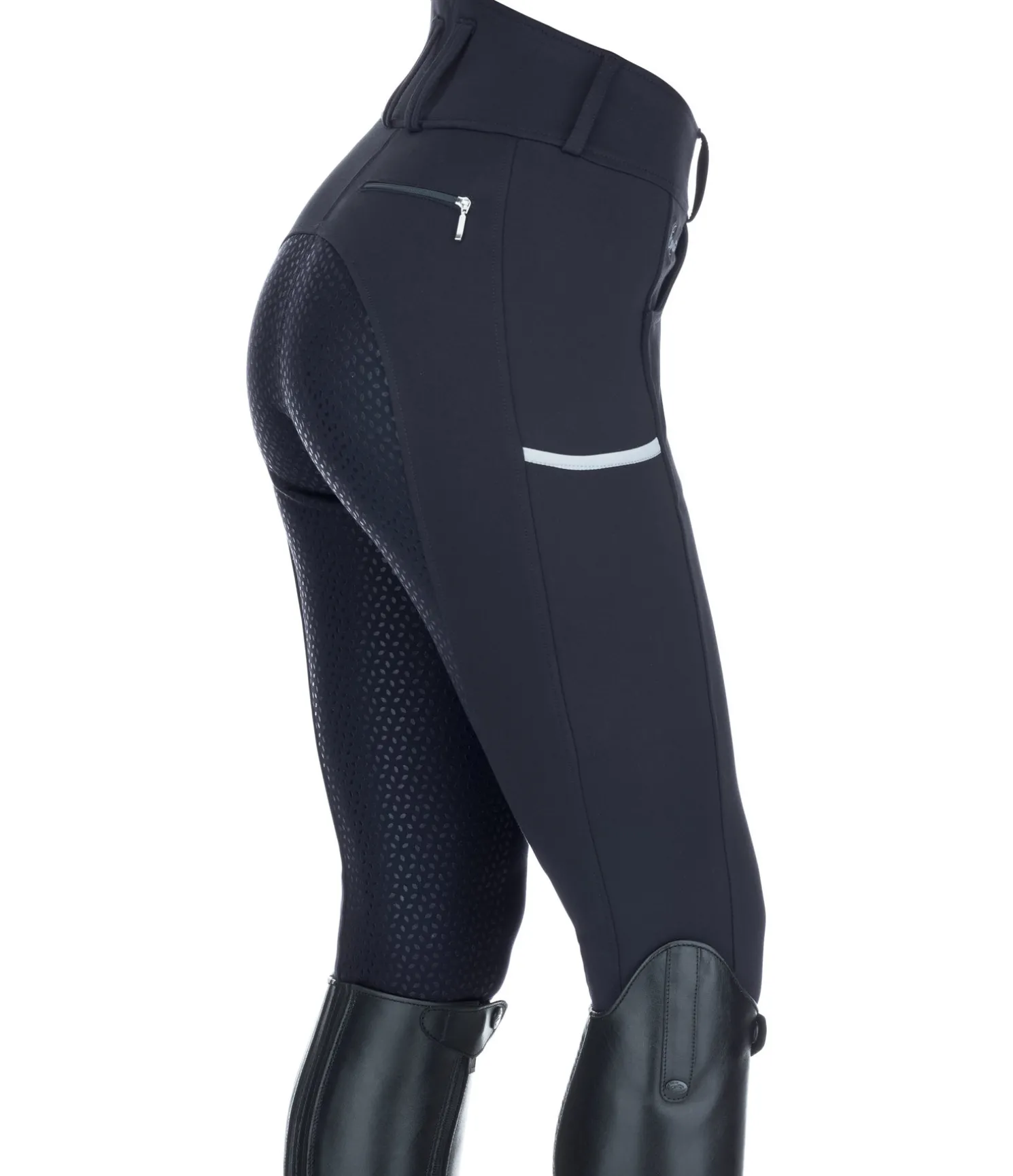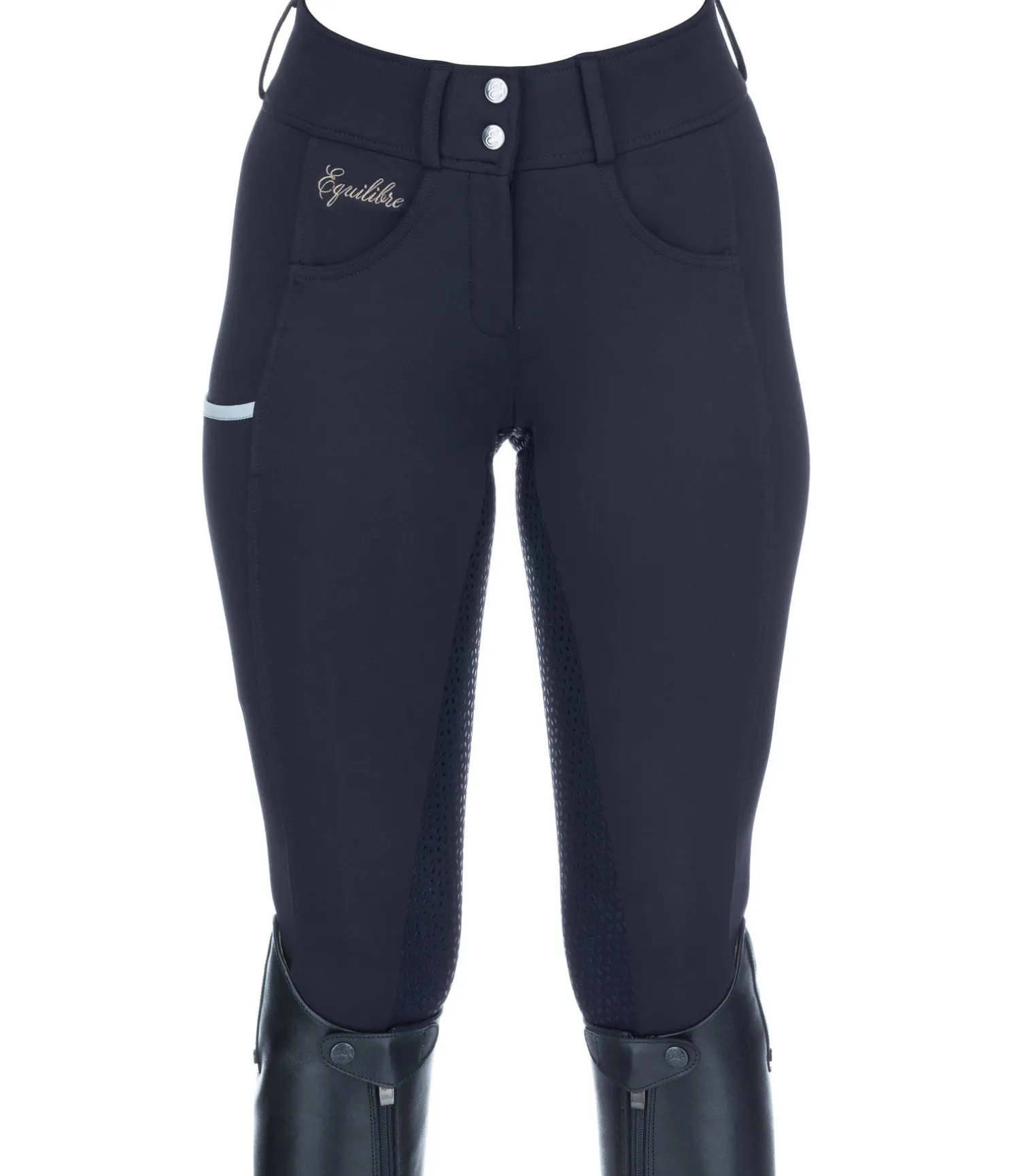 Pantalon d’équitation taille haute. Matière souple super confortable et extensible. Fond intégral grip en silicone. Aucune couture au niveau des genoux. Une poche latérale pour téléphone portable et une poche arrière zippée. Broderie sur l’avant et l’arrière. Bas de jambe extensible sans patte auto-agrippante. 68 % viscose, 27 % nylon, 5 % élasthanne.