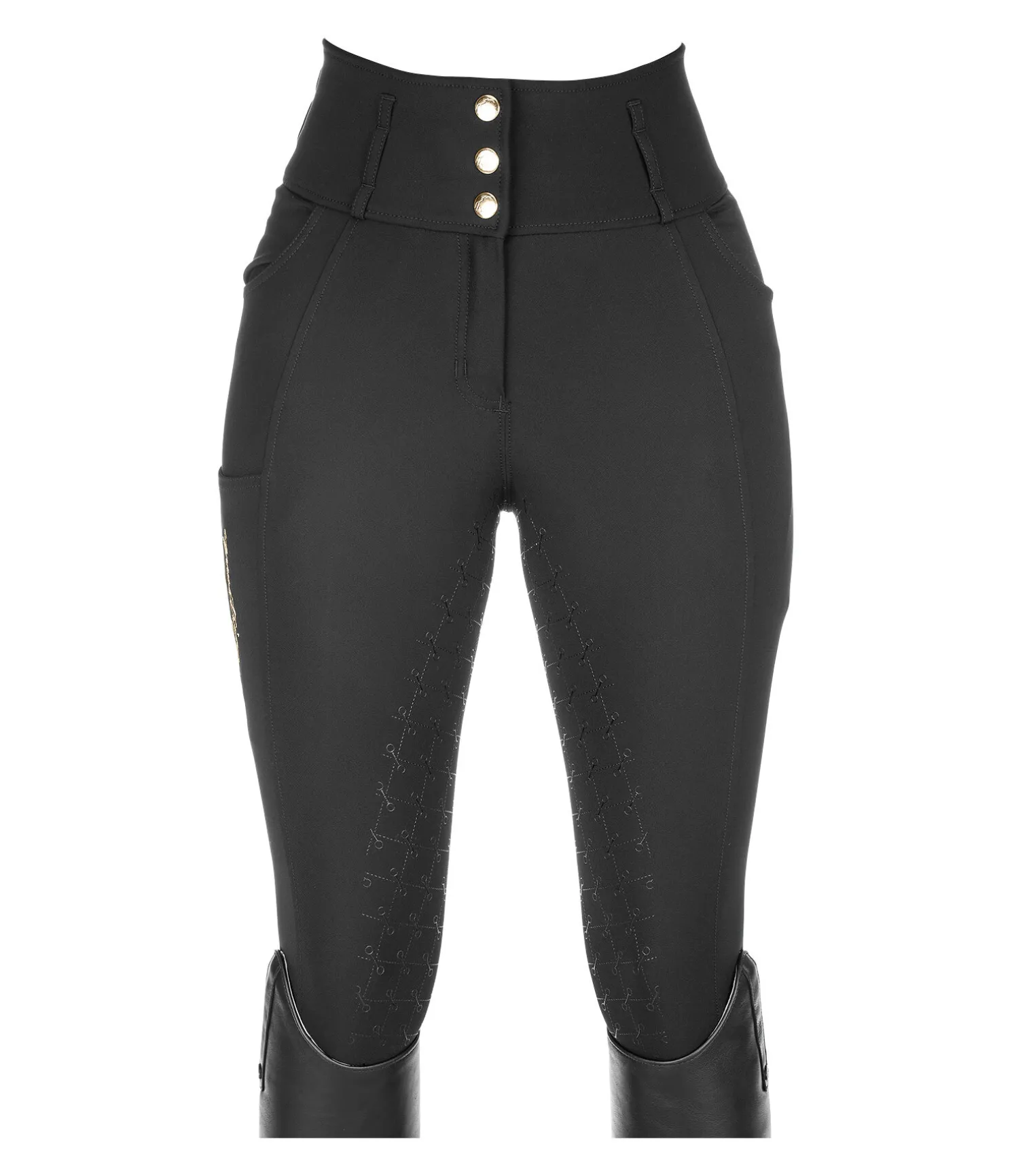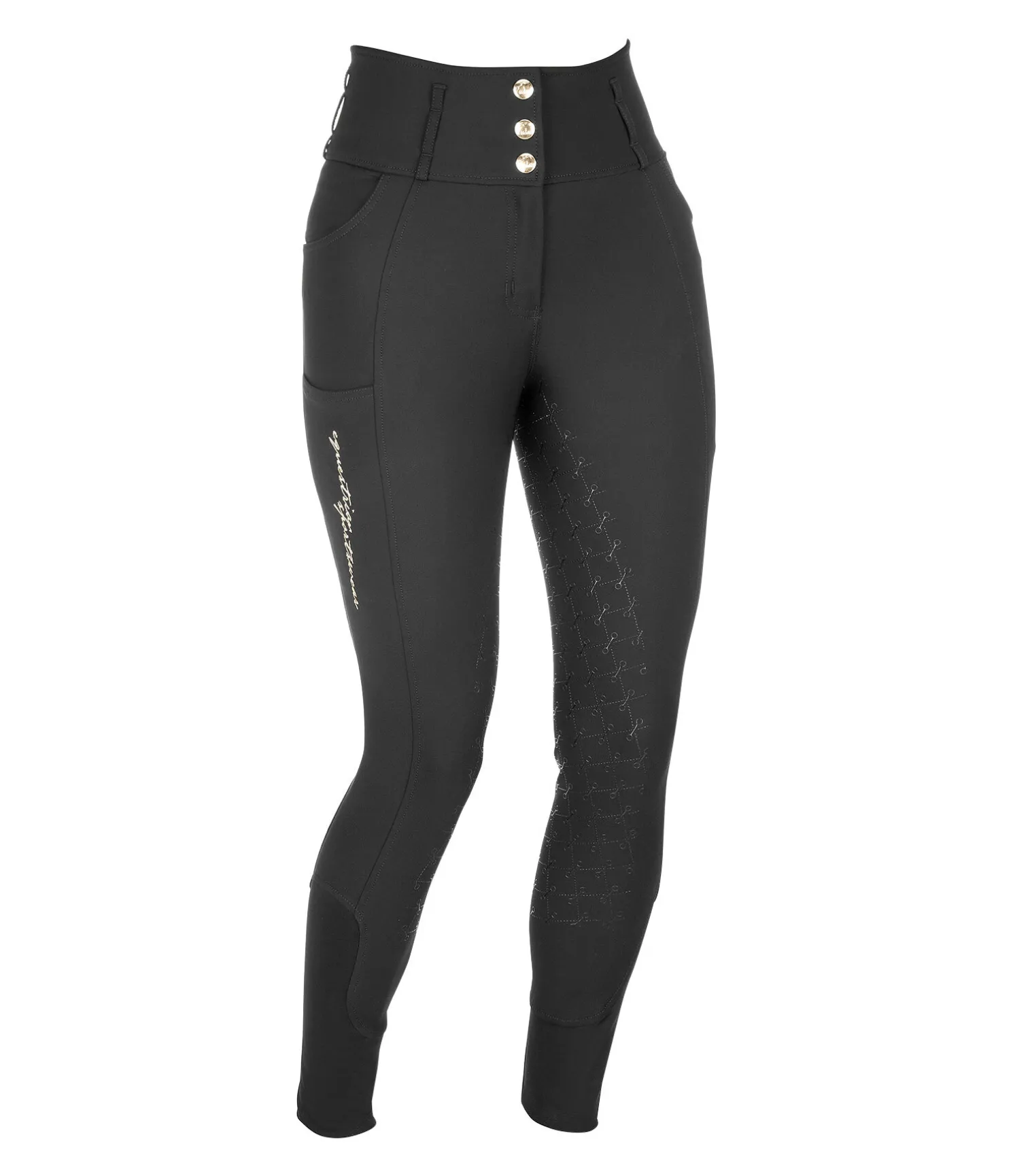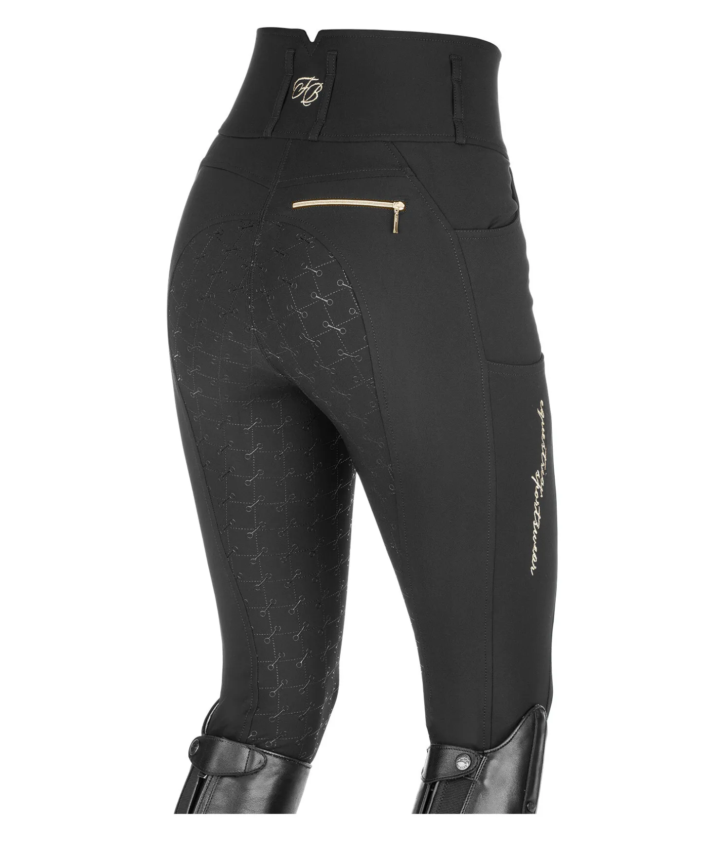 Pantalon d’équitation taille haute. Fond intégral grip avec motif de mors en silicone.Matière respirante et extensible. Séchage rapide. Ceinture large avec passants et trois boutons. Signature Felix Bühler sur la jambe. Une poche arrière zippée. Une poche pour téléphone portable sur la jambe. Deux poches latérales. Aucune couture aux genoux. Bas de jambe en stretch. Matière : 88 % polyamide, 12 % élasthanne.
