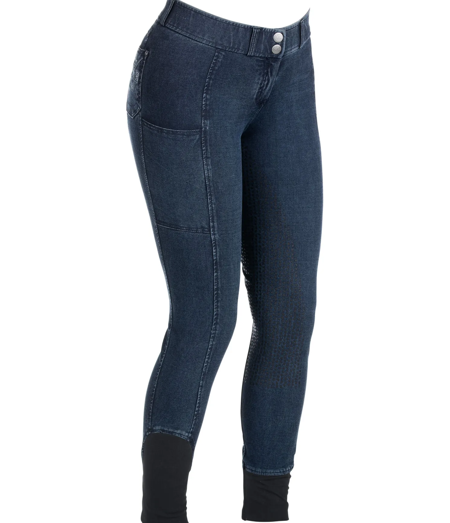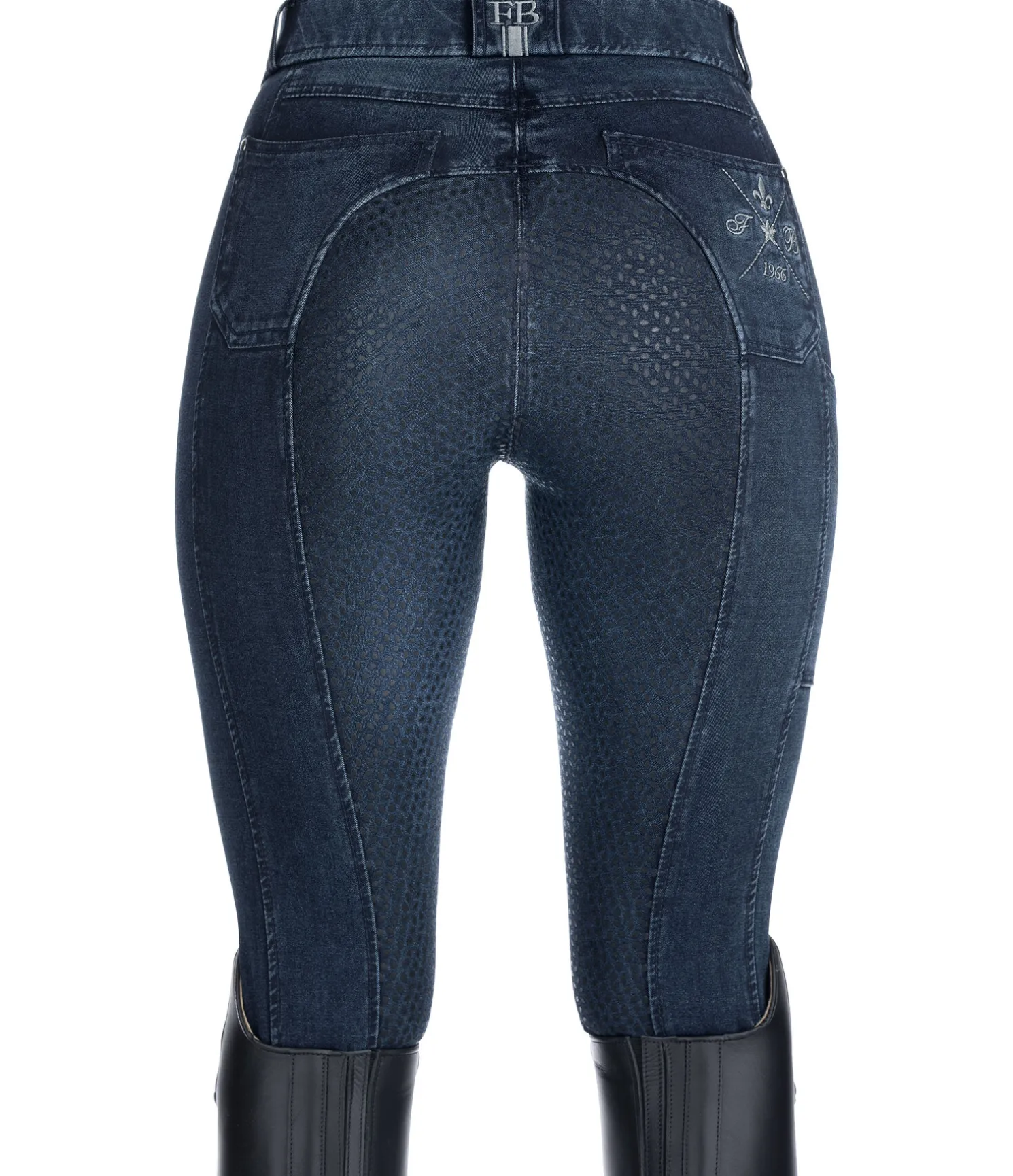 Pantalon d’équitation en denim doux. Fond intégral en silicone. Effet vintage. Ceinture large élastiquée avec deux boutons. Poche sur la cuisse pour téléphone portable et 2 poches arrière. Broderie Felix Bühler à l’arrière. Aucune couture au niveau des genoux. Bas de jambe extensible en matière stretch. 60 % coton, 24 % polyester, 10 % viscose, 6 % élasthanne.