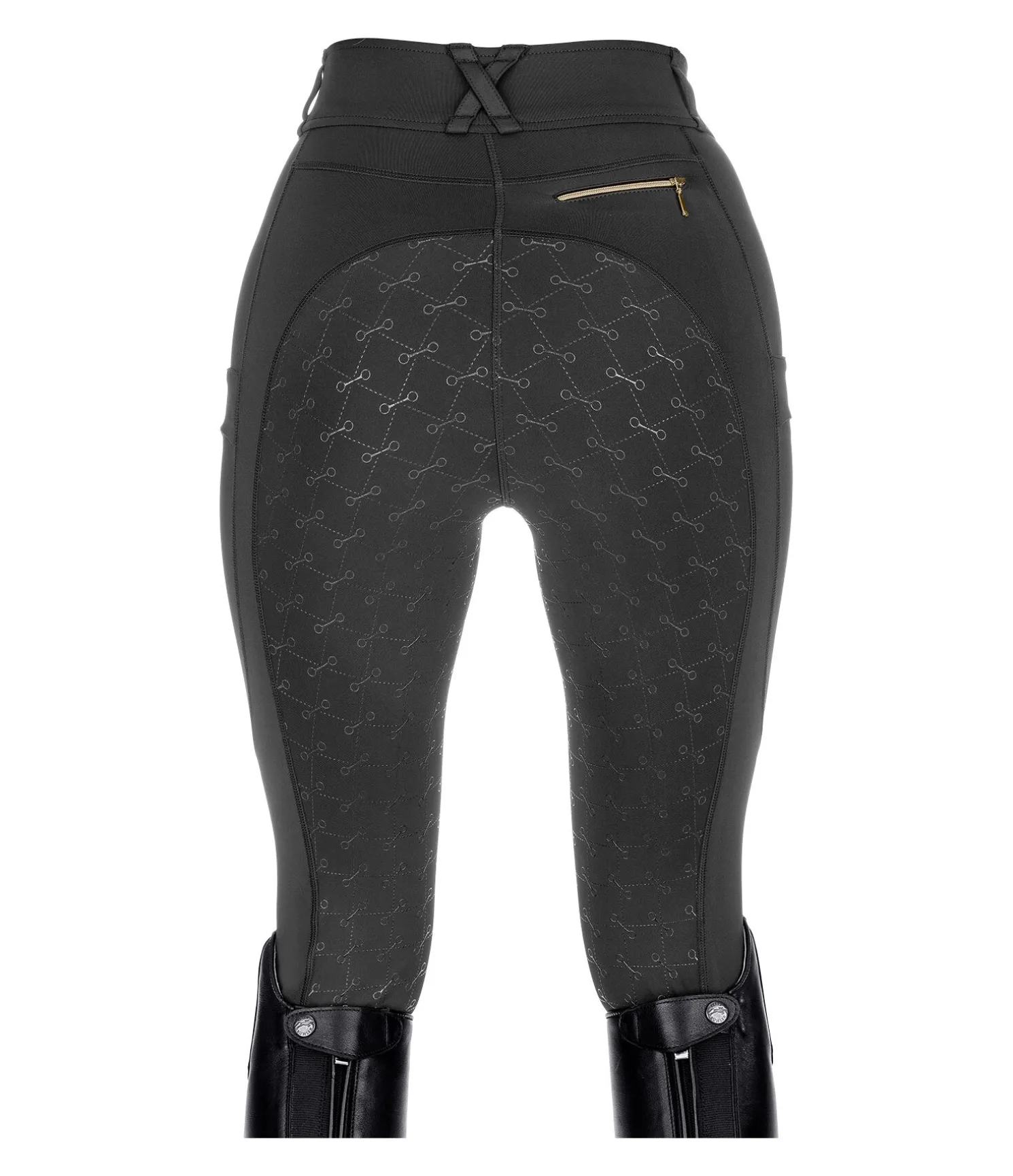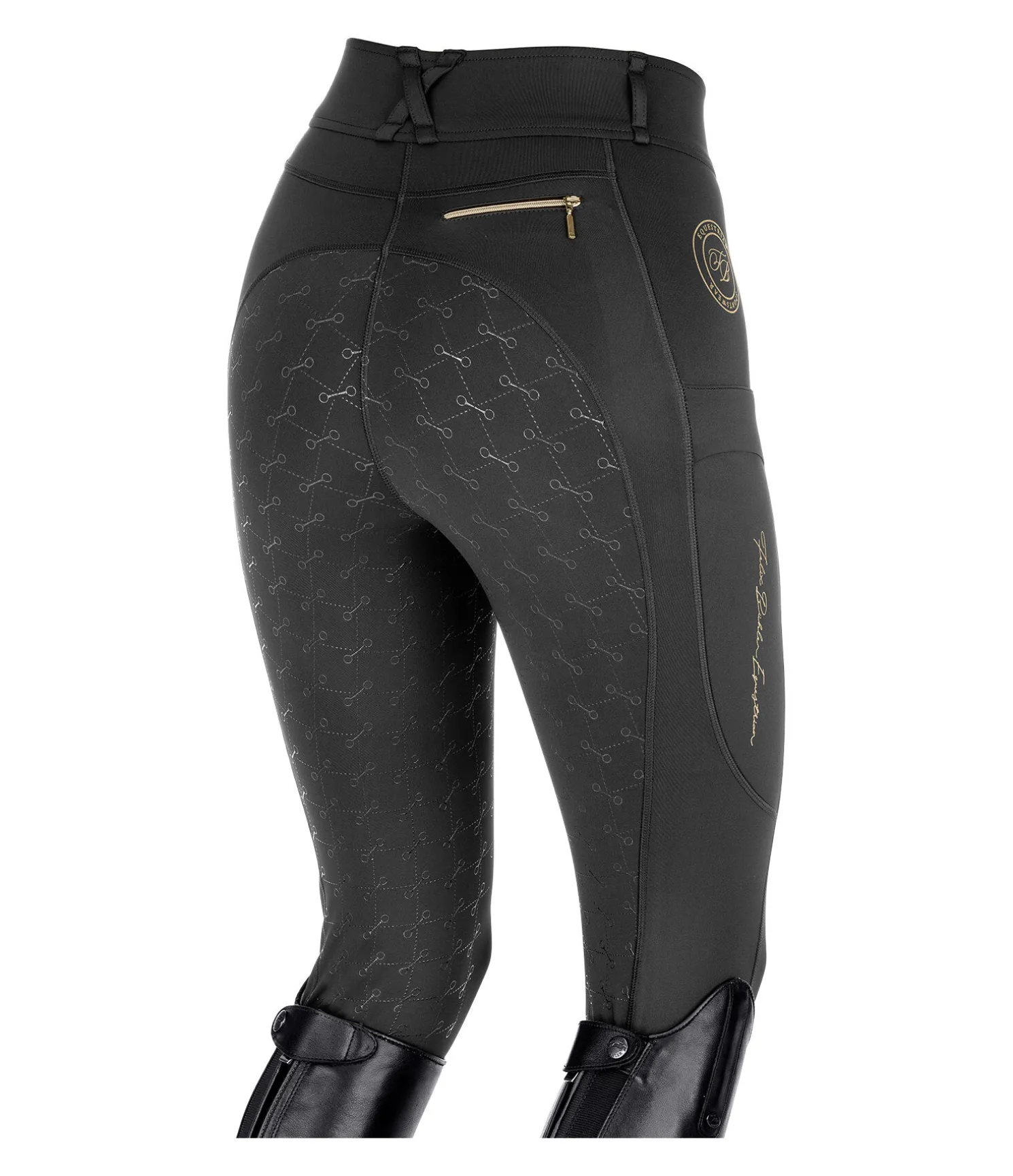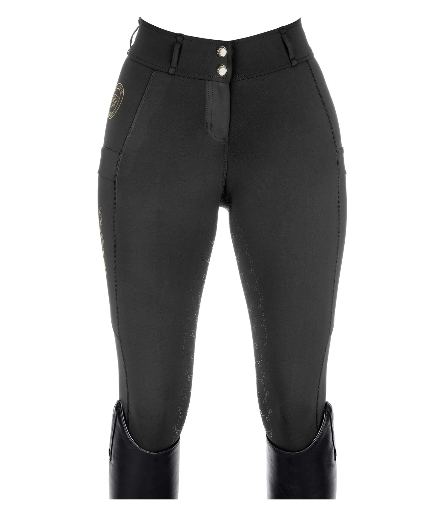 Pantalon d’équitation à fond intégral avec motif de mors en silicone. Stretch Performance extensible dans 4 directions pour un effet sculptant garanti. Matière legging respirante à séchage rapide. Ceinture extra large avec passants. Une poche zippée arrière. Une poche pour téléphone portable sur chaque jambe. Aucune couture aux genoux. Bas de jambe extensible. Badge et signature Felix Bülher scintillants. 78 % polyester, 22 % élasthanne.