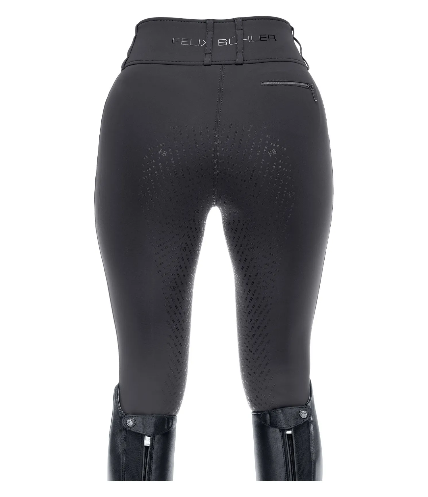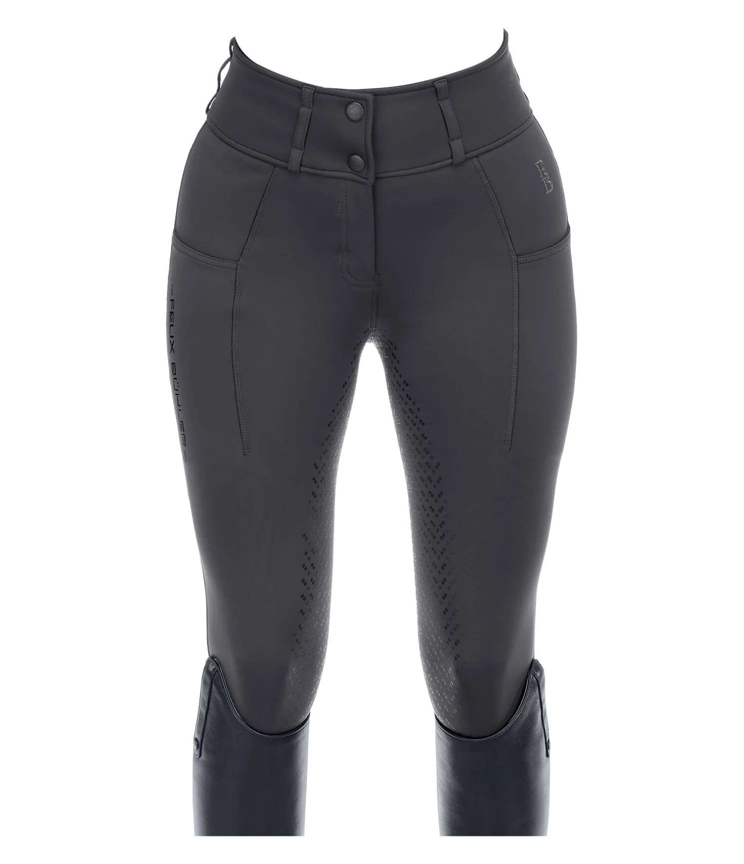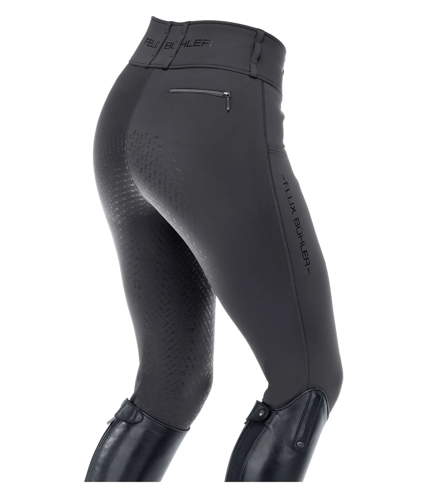 Pantalon d’équitation chaud au look sportif en matière stretch douce et extensible dans 4 directions avec fond intégral en silicone. Respirant et à séchage rapide. 2 poches latérales pour téléphone portable, 1 poche arrière zippée. Imprimés Felix Bühler en silicone et broderie, ceinture large avec passants, sans coutures aux genoux, bas de jambe extensible. 78 % polyamide, 22 % élasthanne.
