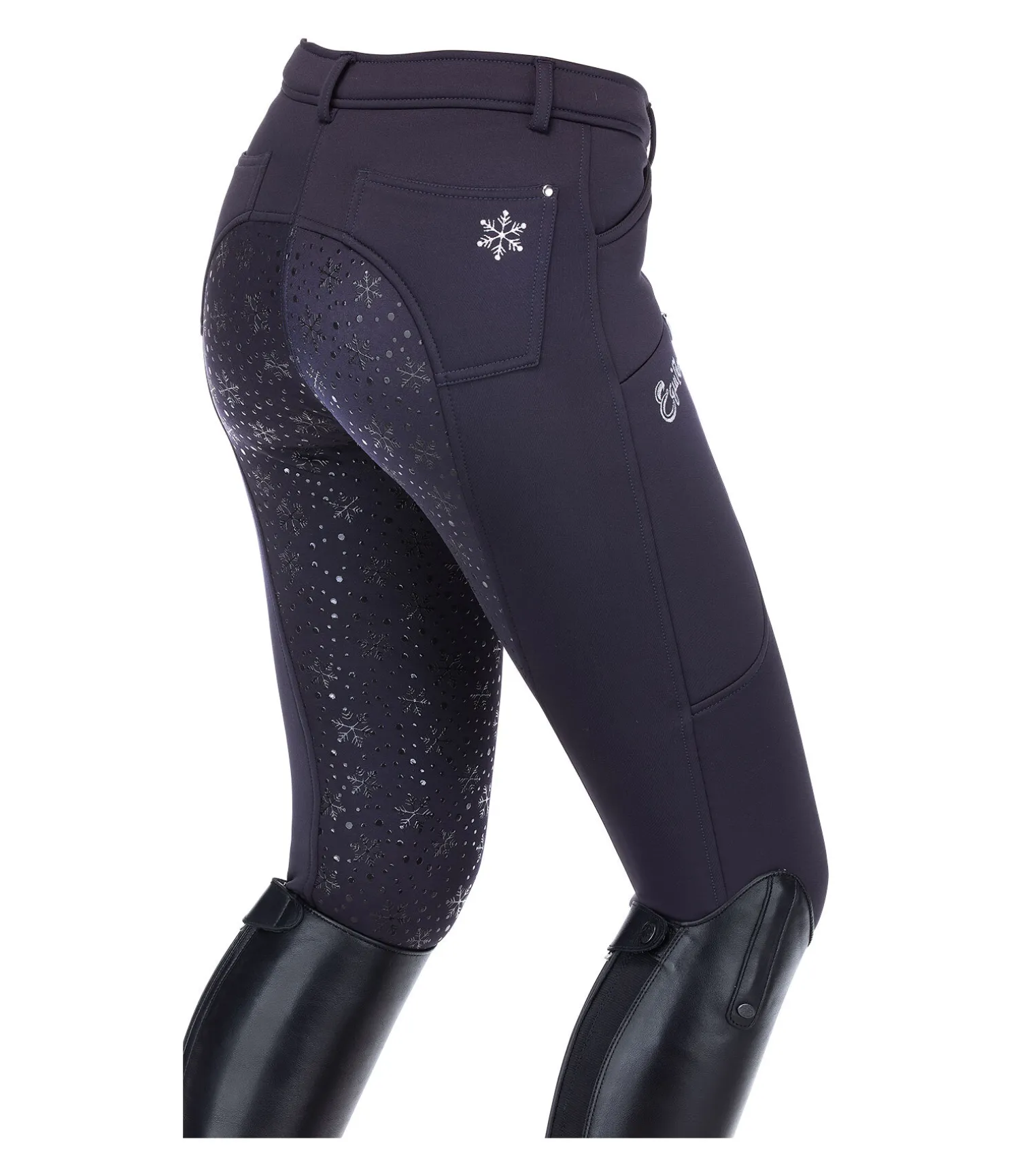 Pantalon d’équitation hiver chaud à fond intégral grip en silicone avec motif flocon de neige. Intérieur molletonné. Bas de jambe extensible. Matière stretch respirante et extensible dans 4 directions. 1 poche zippée sur la cuisse pour téléphone portable avec imprimé Equilibre, 2 poches avant et 2 poches arrière. Ceinture élastiquée avec passants. Joli flocon de neige imprimé sur la poche arrière. 60 % polyester, 33 % polyamide, 7 % élasthanne.