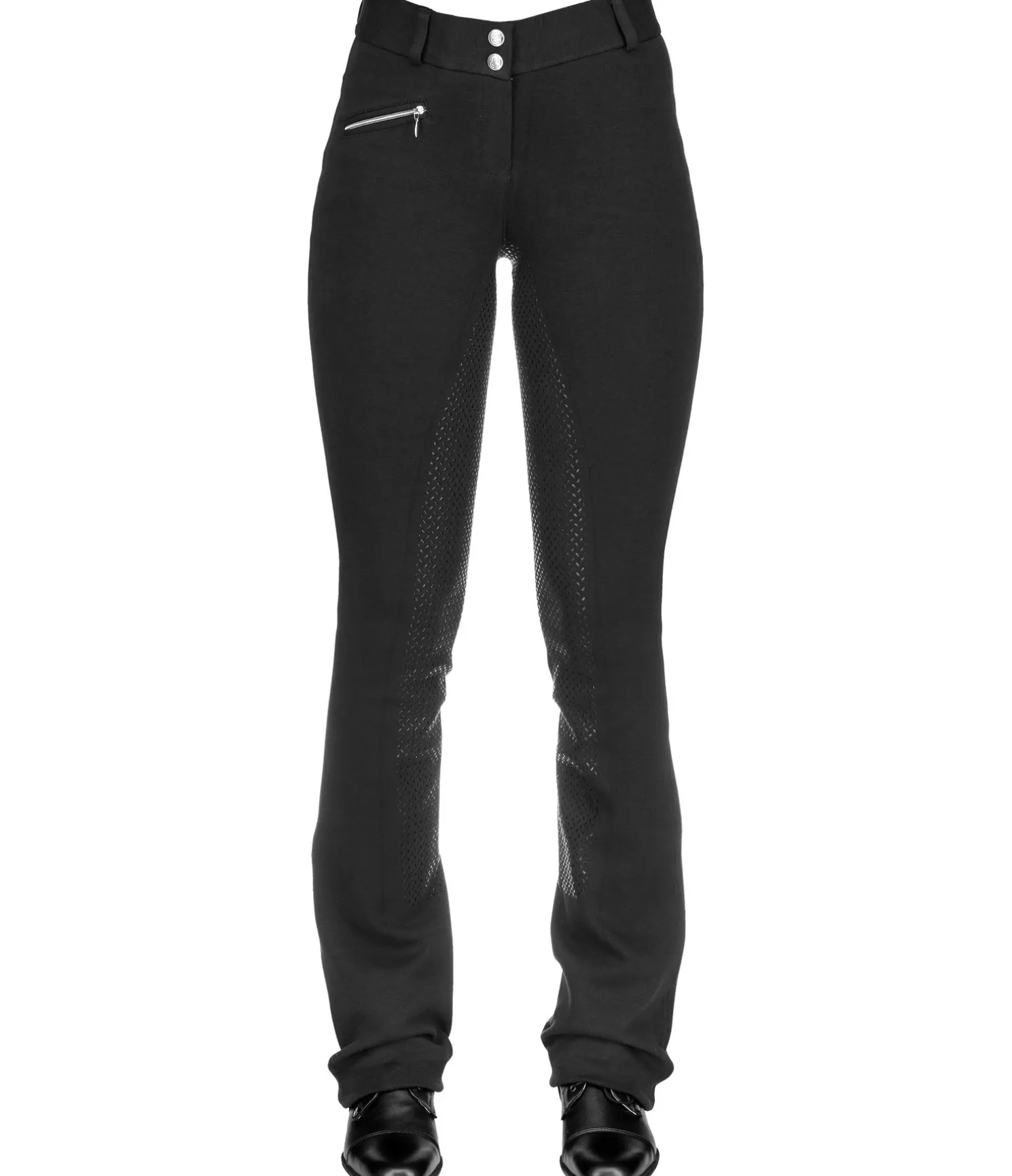 Rapport qualité-prix imbattable ! Pantalon d’équitation jodhpur confortable. Fond intégral grip en silicone. Large ceinture élastiquée avec deux boutons. Une poche avant zippée. Coupe bootcut. Aucune couture sur les genoux. Sous-pied élastique réglable. Matière très extensible et douce. 95 % coton, 5 % élasthanne.