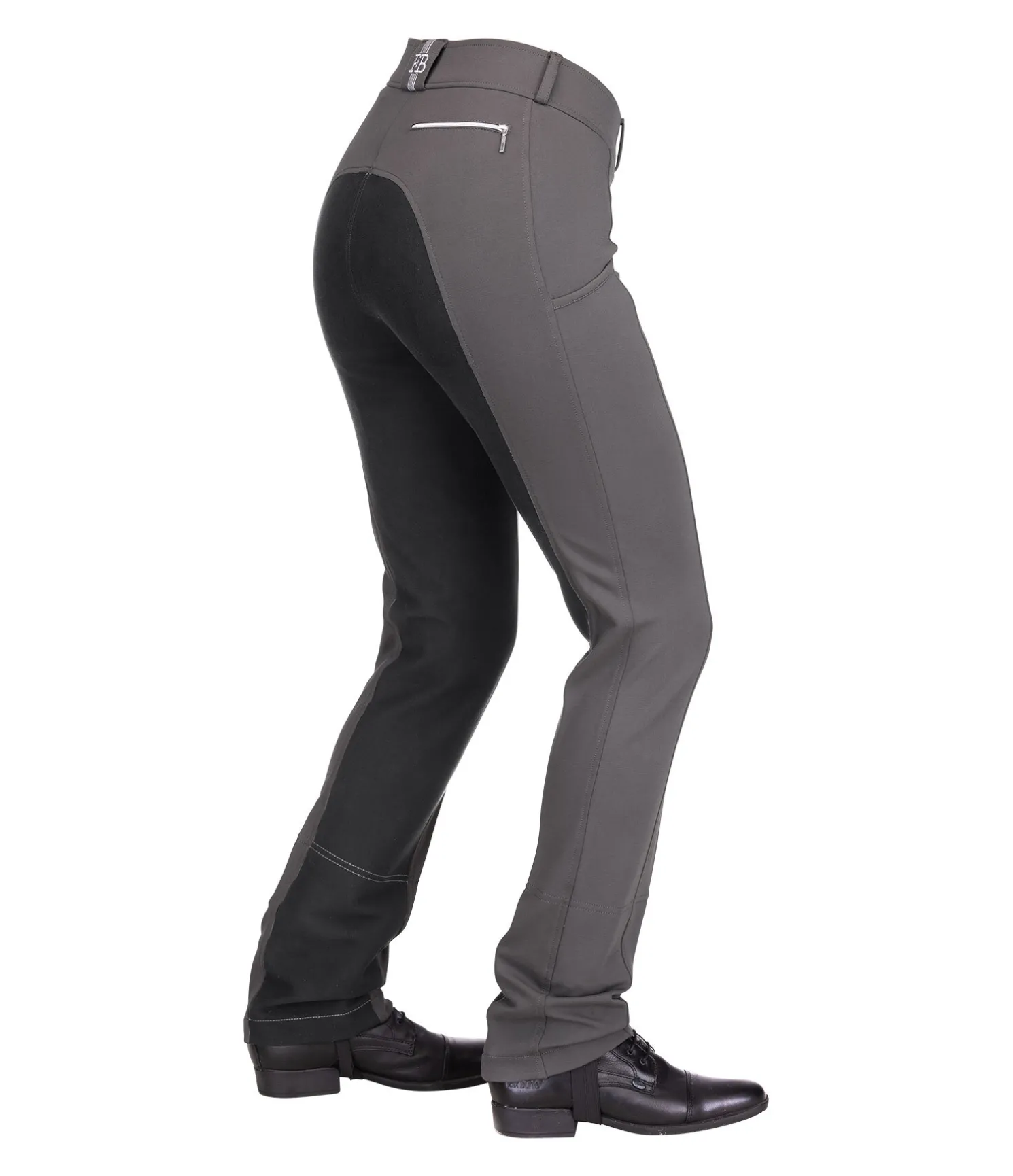 Pantalon d’équitation jodphur confortable. Fond intégral en synthétique. Large ceinture élastiquée avec deux boutons. Une poche zippée arrière et une poche pour téléphone portable sur la jambe. Broderie Felix Bühler à l’arrière. Bas de jambe évasé. Sous-pieds réglables. Matière très extensible et extrêmement douce. 68 % viscose, 27 % nylon, 5 % élasthanne.