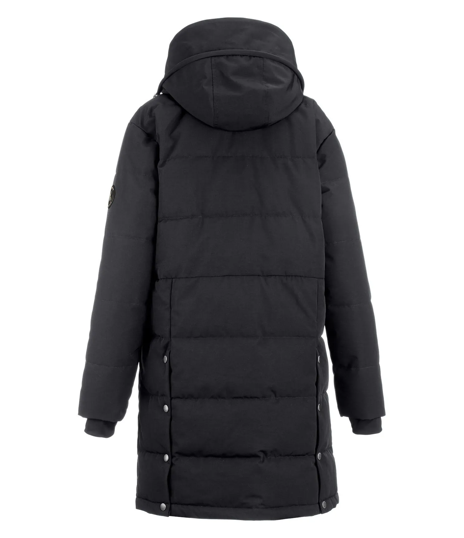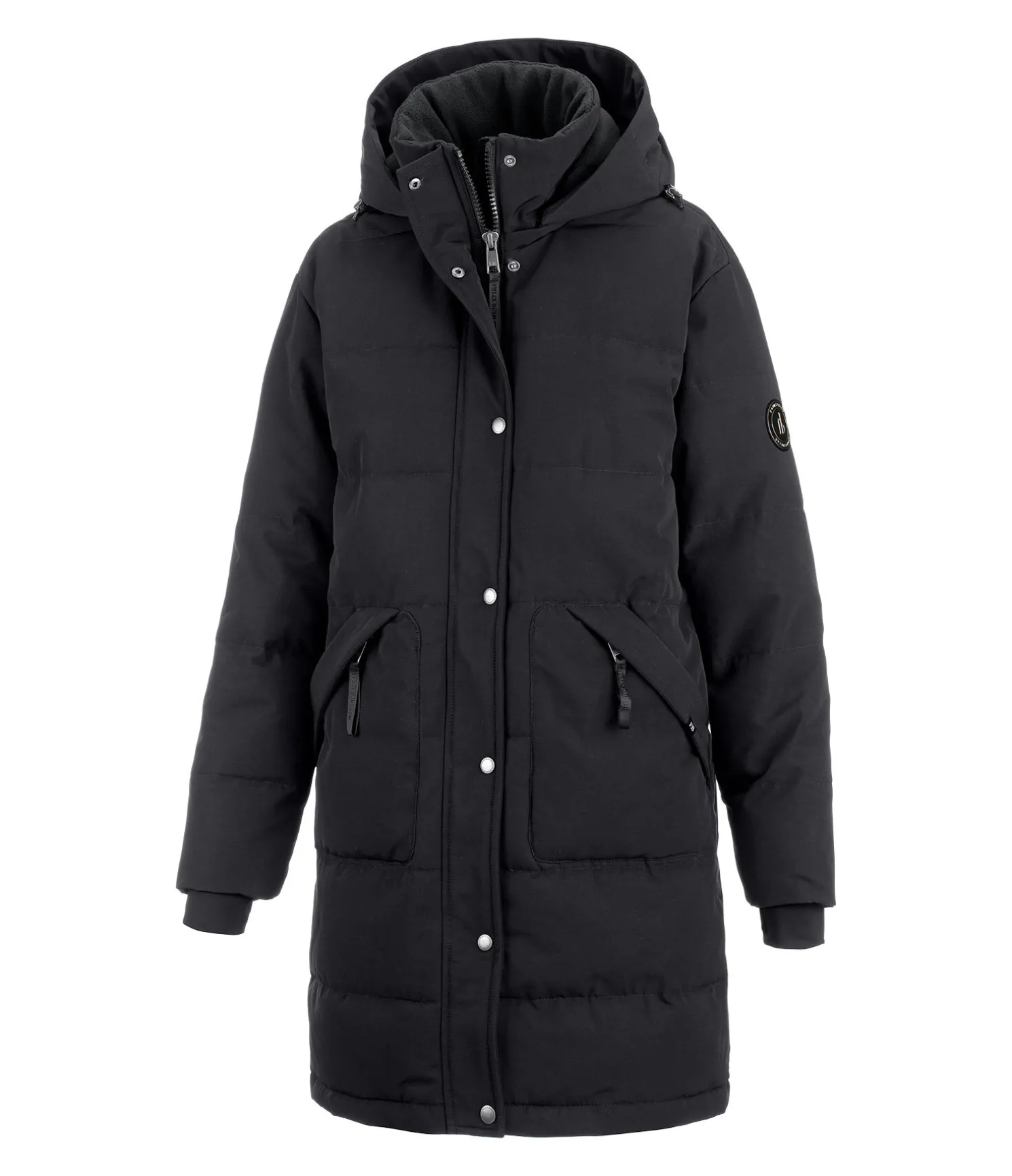 Parka effet doudoune solide, chaude et longue avec capuche. Capuche réglable rembourrée et doublée de polaire douce, amovible par fermeture à glissière et pouvant être fixée dans le dos par bouton-pression. Coupe-vent et très déperlante. Garnissage chaud en imitation duvet. Fermeture à glissière double sens dissimulée, 2 doubles poches plaquées et zippées dissimulées, toutes doublées de polaire chaude. 2 fentes cavalières avec boutons pression à l’arrière, 1 poche intérieure zippée, bas de manche avec finition bord-côte coupe-vent. 100 % polyester.