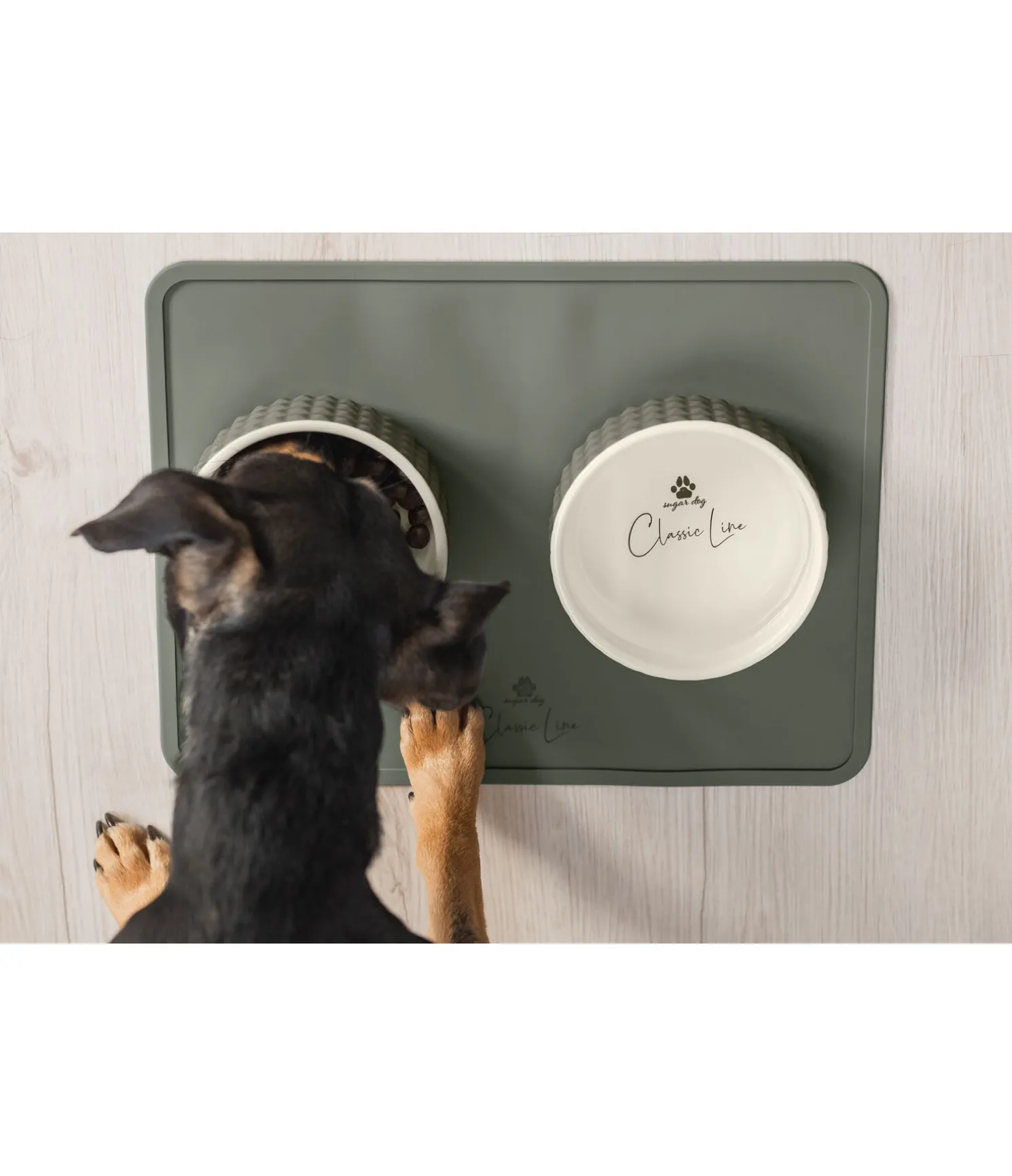 Plateau pour gamelles en silicone lavable et enroulable avec rebord protecteur. Compatible lave-vaisselle. Empêche les gamelles de glisser et protège le sol des restes de nourriture et de liquide. Assorti à la gamelle en céramique sugar dog Berkeley (231 086). 40 x 30 cm.