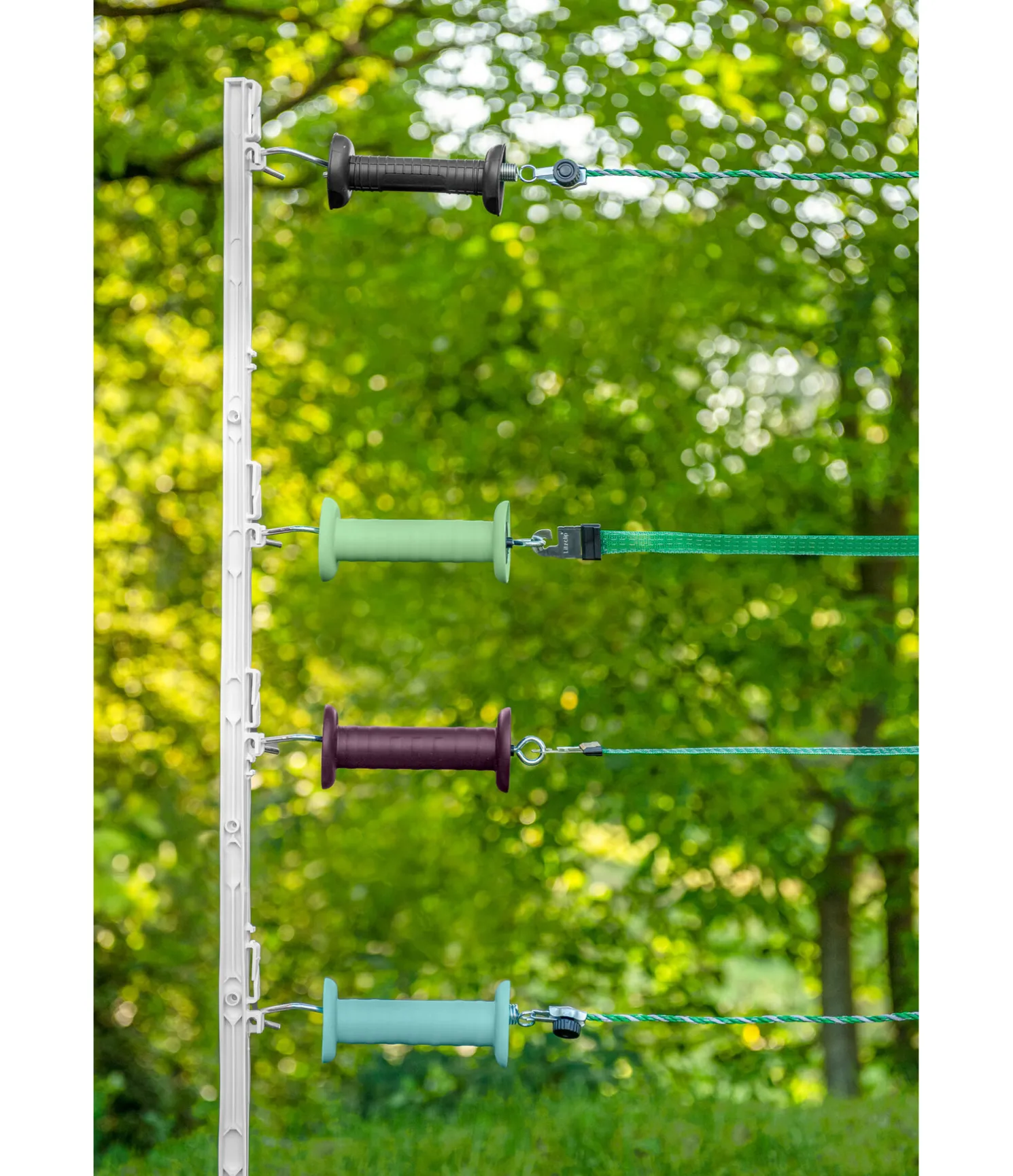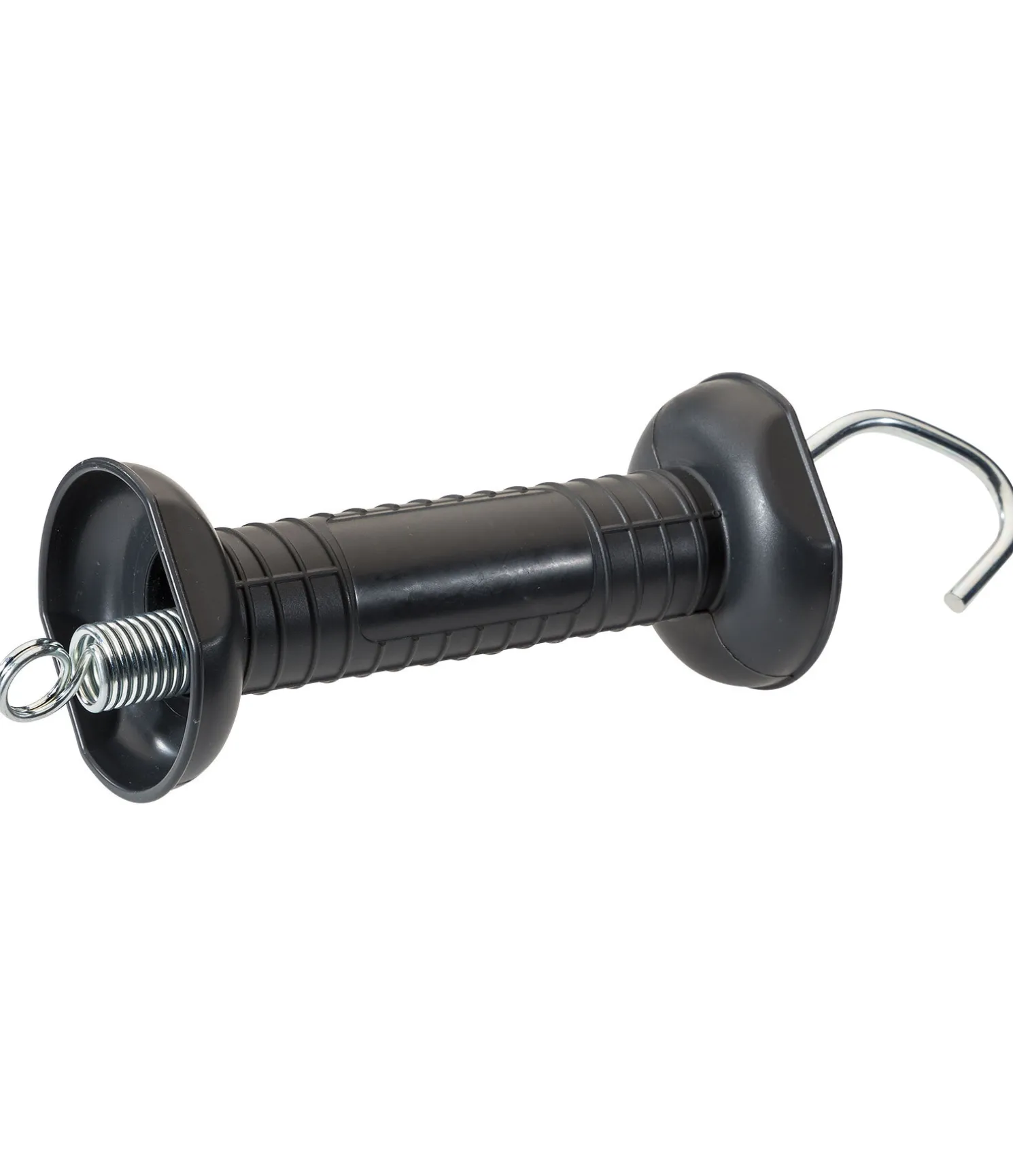 Poignée de clôture en matière plastique recyclée de haute qualité. Crochet et ressort galvanisés. Ressort de traction simple.
