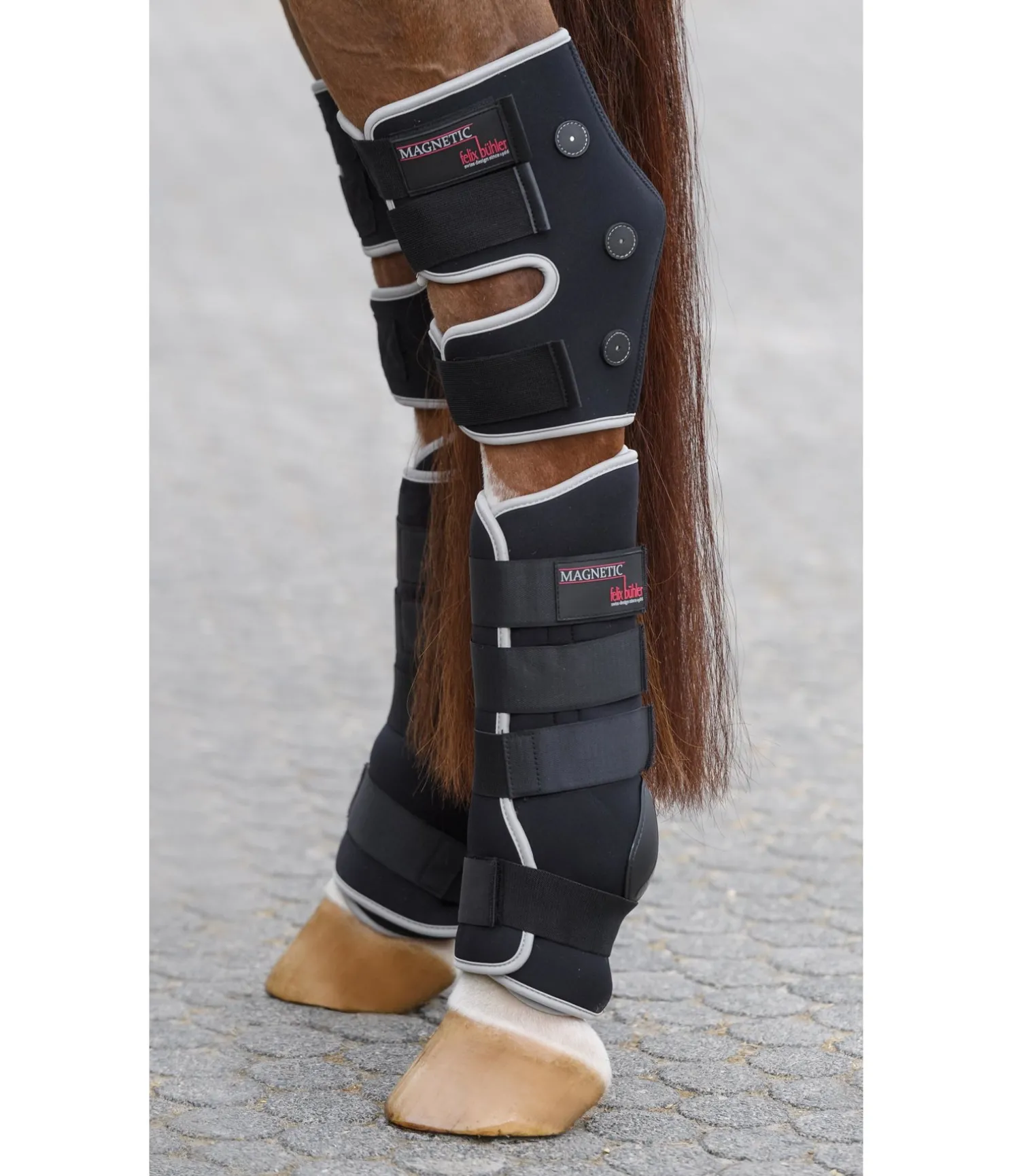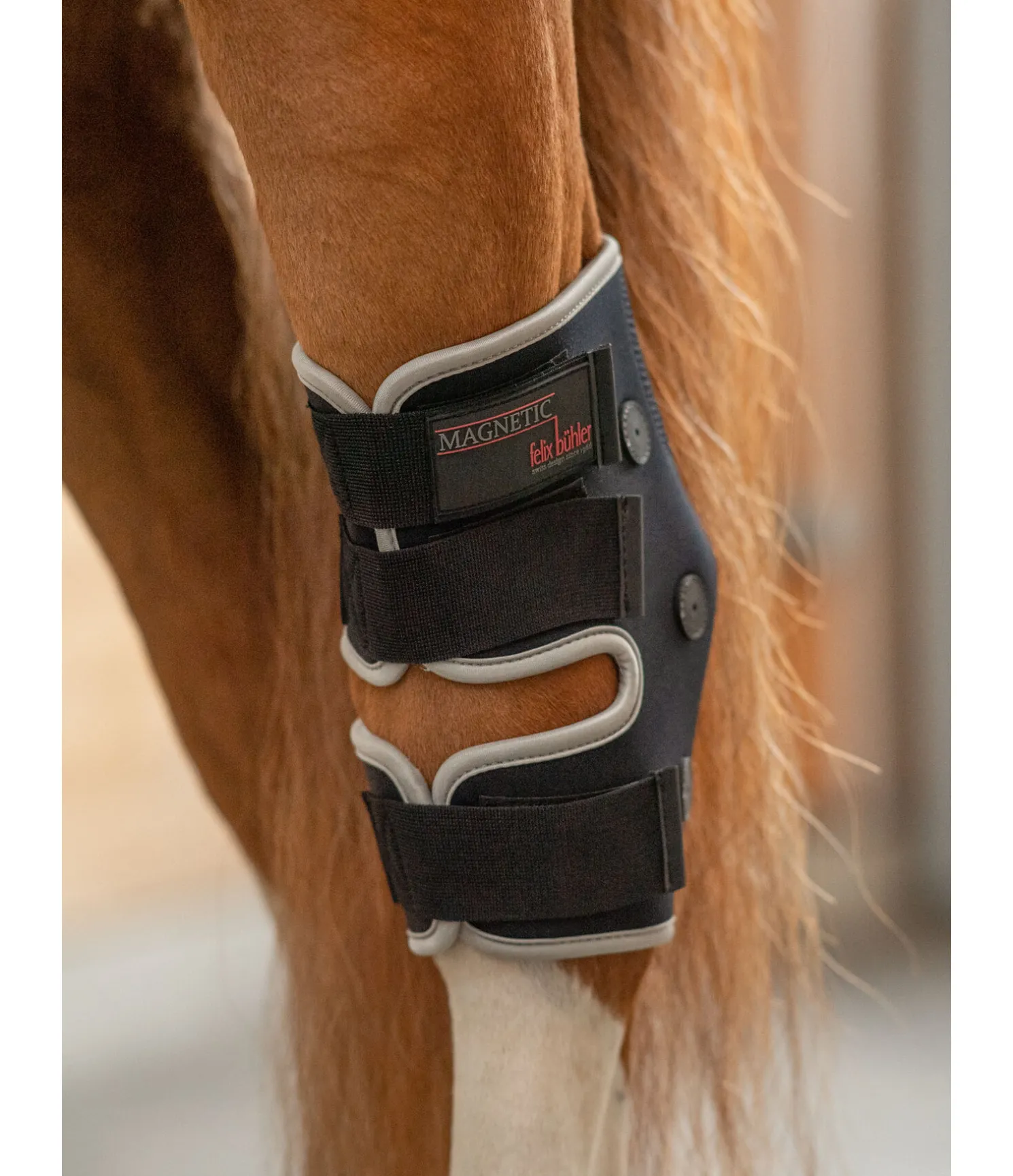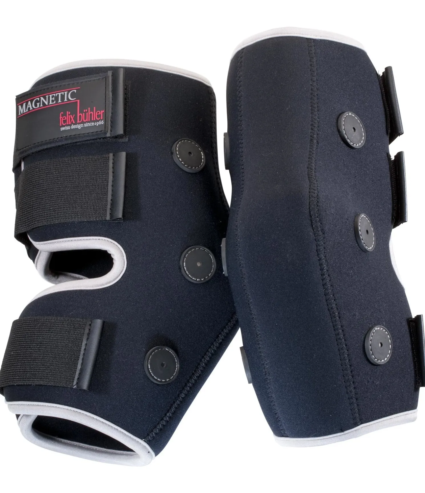 Protège-jarrets anatomiques à usage thérapeutique en caoutchouc chloroprène avec 6 aimants (30 % néodyme, 65 % fer, 5 % bore, force magnétique : 2800 gauss) qui permettent de soulager les douleurs articulaires et d’améliorer la circulation sanguine. Taille réglable grâce aux 3 pattes auto-agrippantes.Vendus par paire.