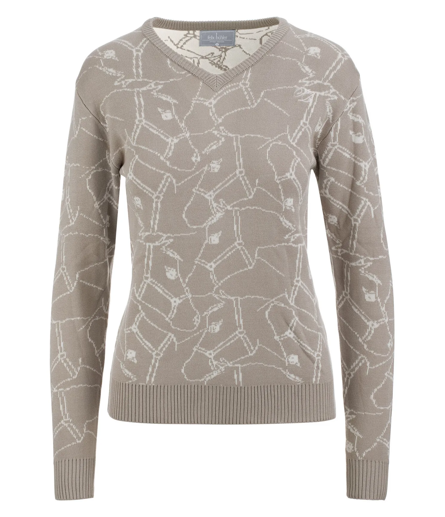 Pull col V doux, tissé en jacquard avec imprimé cheval. Logo brodé sur la poitrine. Finition en bord-côte sur le col, le bas des manches et l’ourlet. 55 % viscose, 45 % polyacrylique.