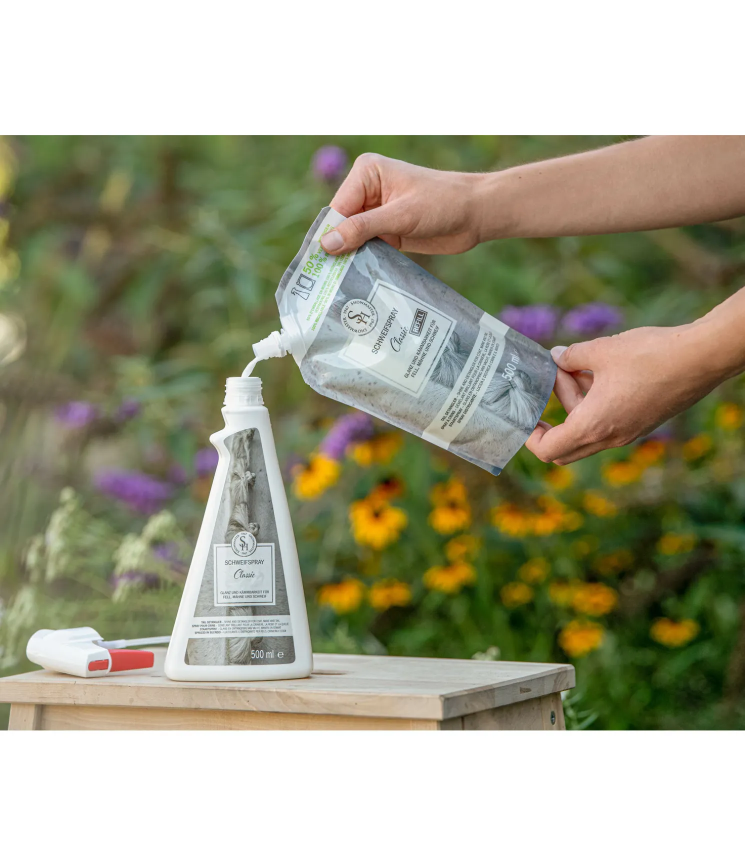 Spray à crins pour le soin de la robe, de la crinière et de la queue sous forme de recharge écologique et durable – 50 % d’emballage en moins en comparaison au pulvérisateur habituel et jusqu’à 100 % recyclable ! Les crins sont plus faciles à brosser et à démêler. Confère à la robe une brillance soyeuse, un toucher incroyablement doux et empêche les poussières de s’y accrocher. Pendant toute la période d’effet du produit, la queue, la crinière et la robe de votre cheval seront brillants et soignés. Les taches d’urine, d’herbe ou de sueur séchées seront faciles à faire disparaître au brossage.