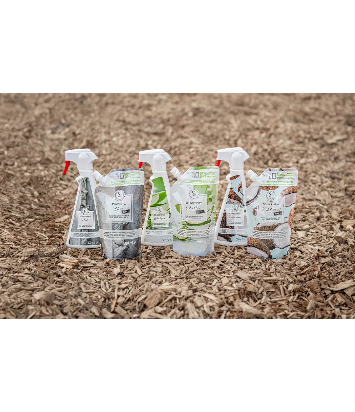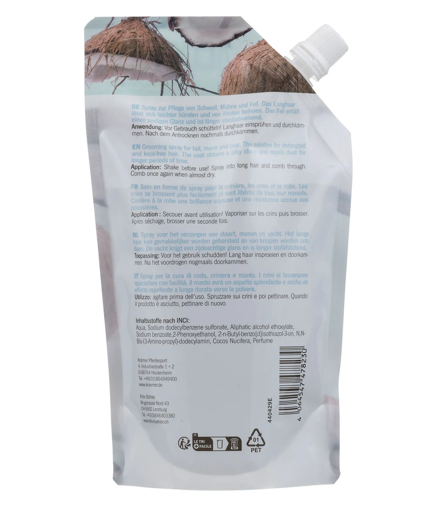 Spray à crins pour le soin de la robe, de la crinière et de la queue sous forme de recharge écologique et durable au parfum de noix de coco, 50 % d’emballage en moins en comparaison au pulvérisateur habituel. 100 % recyclable ! Les crins sont plus faciles à brosser et à démêler. Confère à la robe une brillance soyeuse, un toucher incroyablement doux et empêche les poussières de s’accrocher. Pendant toute la période d’effet du produit, la queue, la crinière et la robe du cheval sont brillantes et soignées. Les taches d’urine, d’herbe ou de sueur séchées disparaissent facilement au brossage.