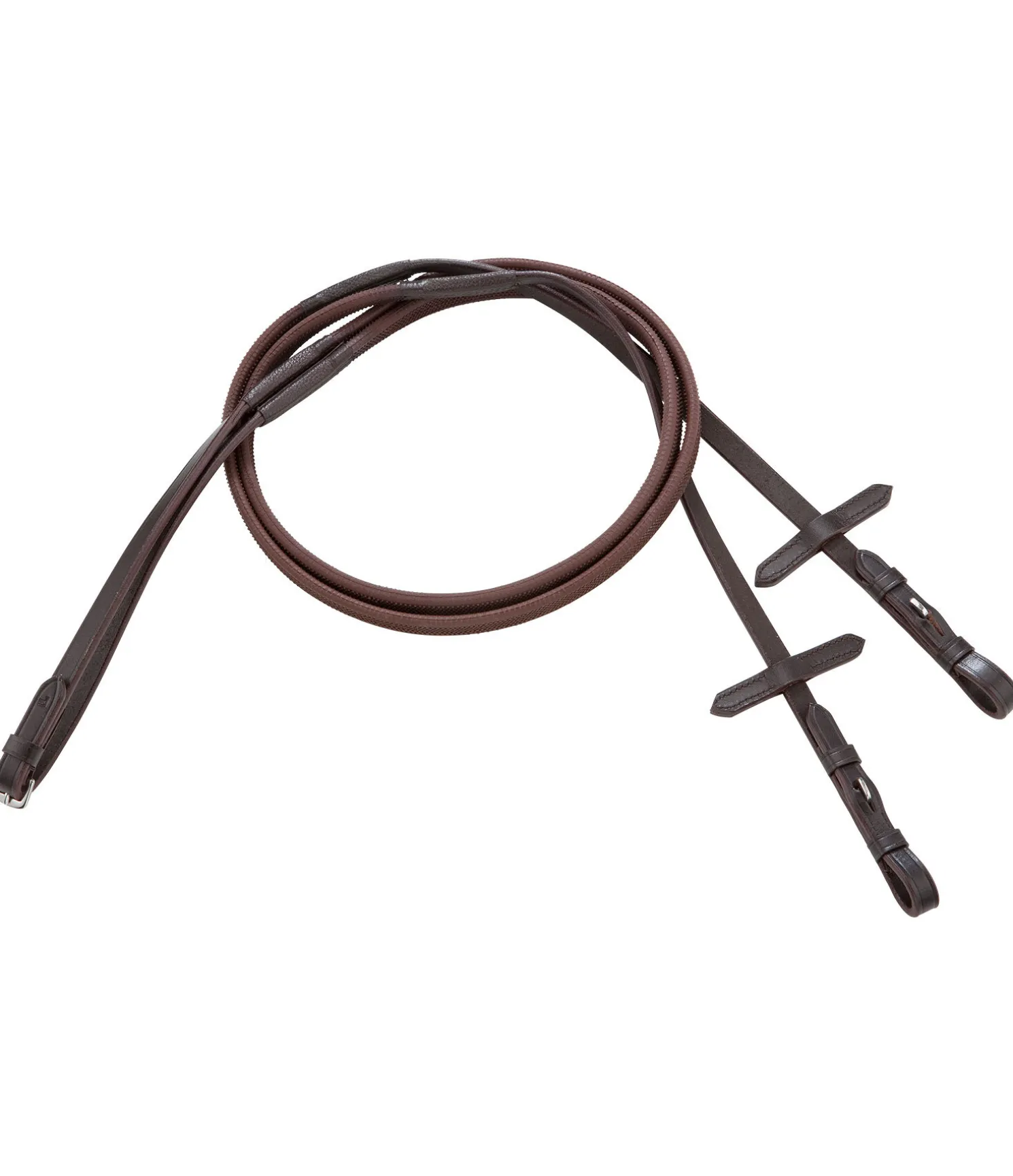 Rênes en caoutchouc particulièrement agréables en main grâce à une coupe plus étroite et des picots en caoutchouc plus petits. Pièce centrale et extrémités des rênes en cuir de qualité avec arrêtoirs de martingale. Largeur de 1,5 cm. P (poney – longueur 260 cm), F (full – longueur 290 cm), XF (taille maxi – longueur 305 cm).