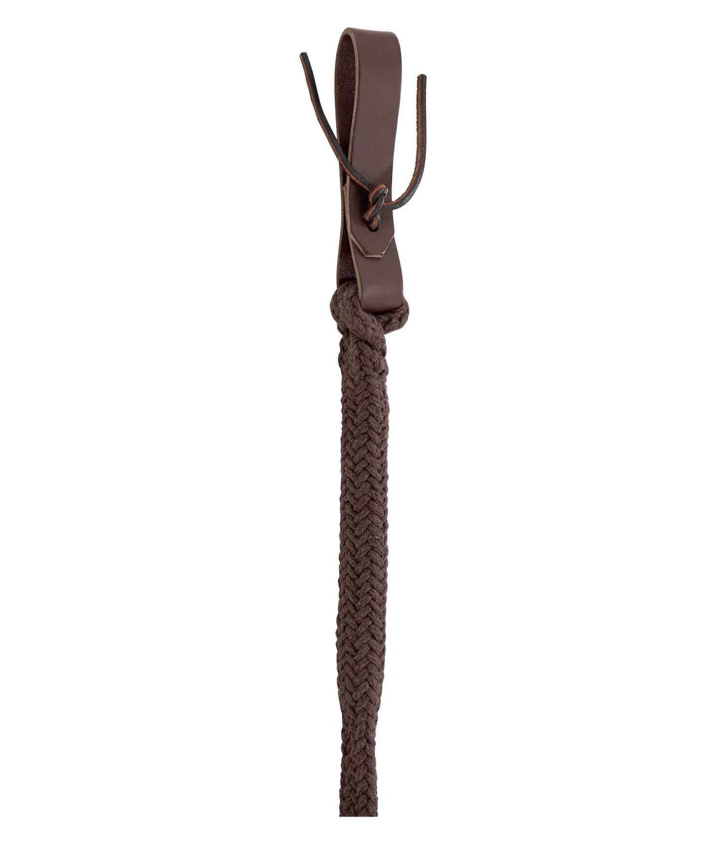 Rênes fermées en coton avec slobber bars. Tressé plat pour une meilleure prise en main. Longueur : 3,10 m.