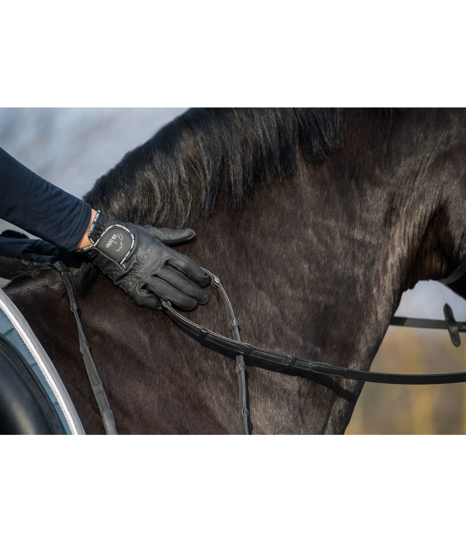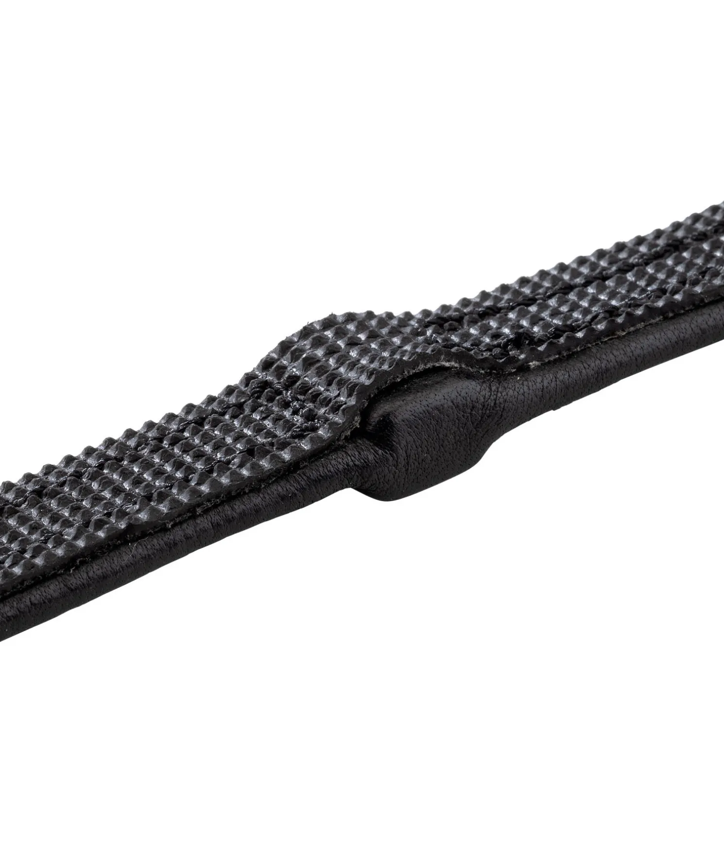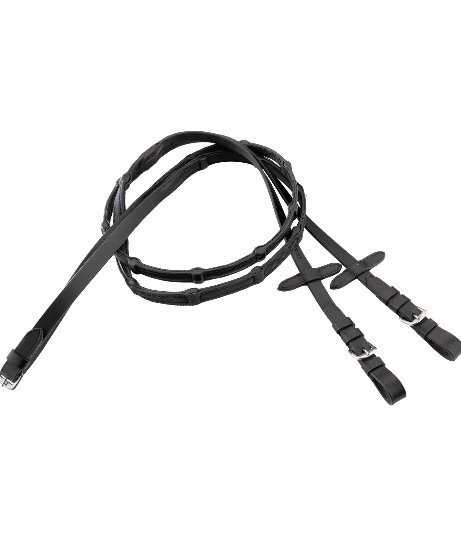 Rênes en cuir avec arrêtoirs Soft-Stops et revêtement en caoutchouc antidérapant permettant une bonne prise en main. Avec arrêtoirs de martingale. Bouclerie argentée. 290 x 1,4 cm.