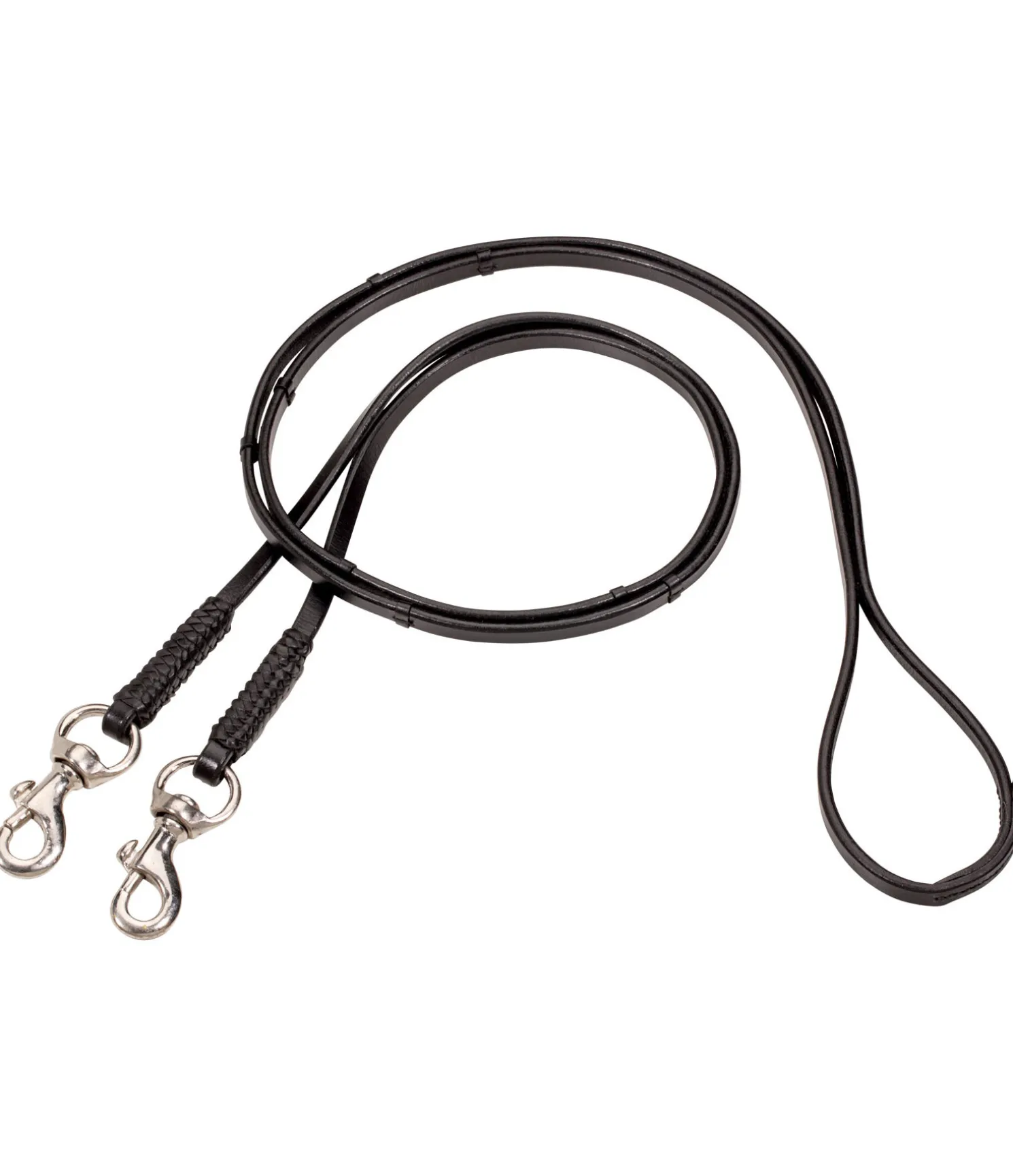 Rênes fines en cuir de qualité, avec embouts tressés à la main et arrêtoirs cousus. 250 cm.