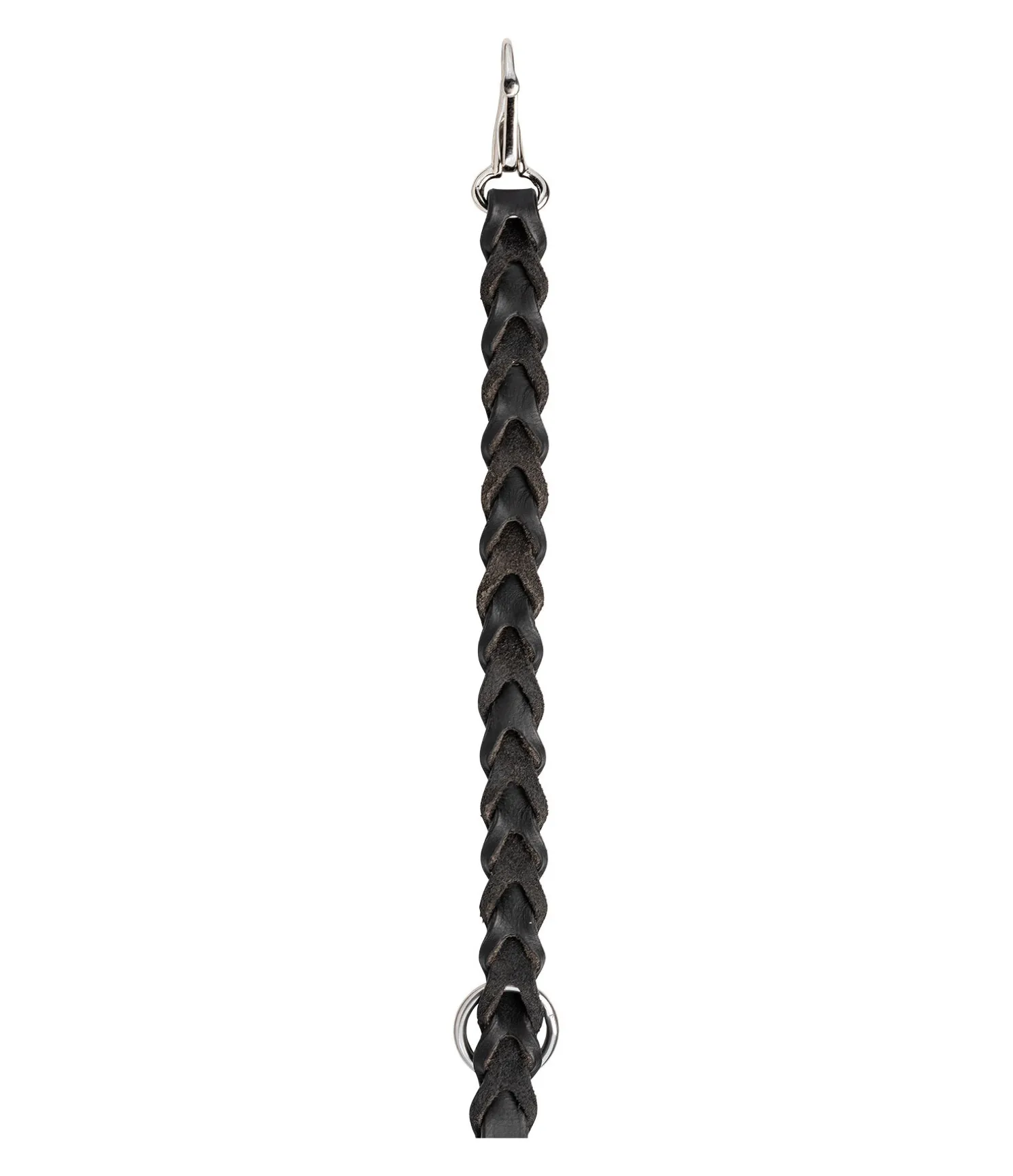 Rênes en cuir gras multifonction idéales pour de longues randonnées à cheval. Mousquetons snaps ovales métallisés. Extrémités tressées.L’anneau métallique présent de chaque côté permet de clipser un mousqueton et d’utiliser les rênes comme longe et mener son cheval en main ou le faire brouter.