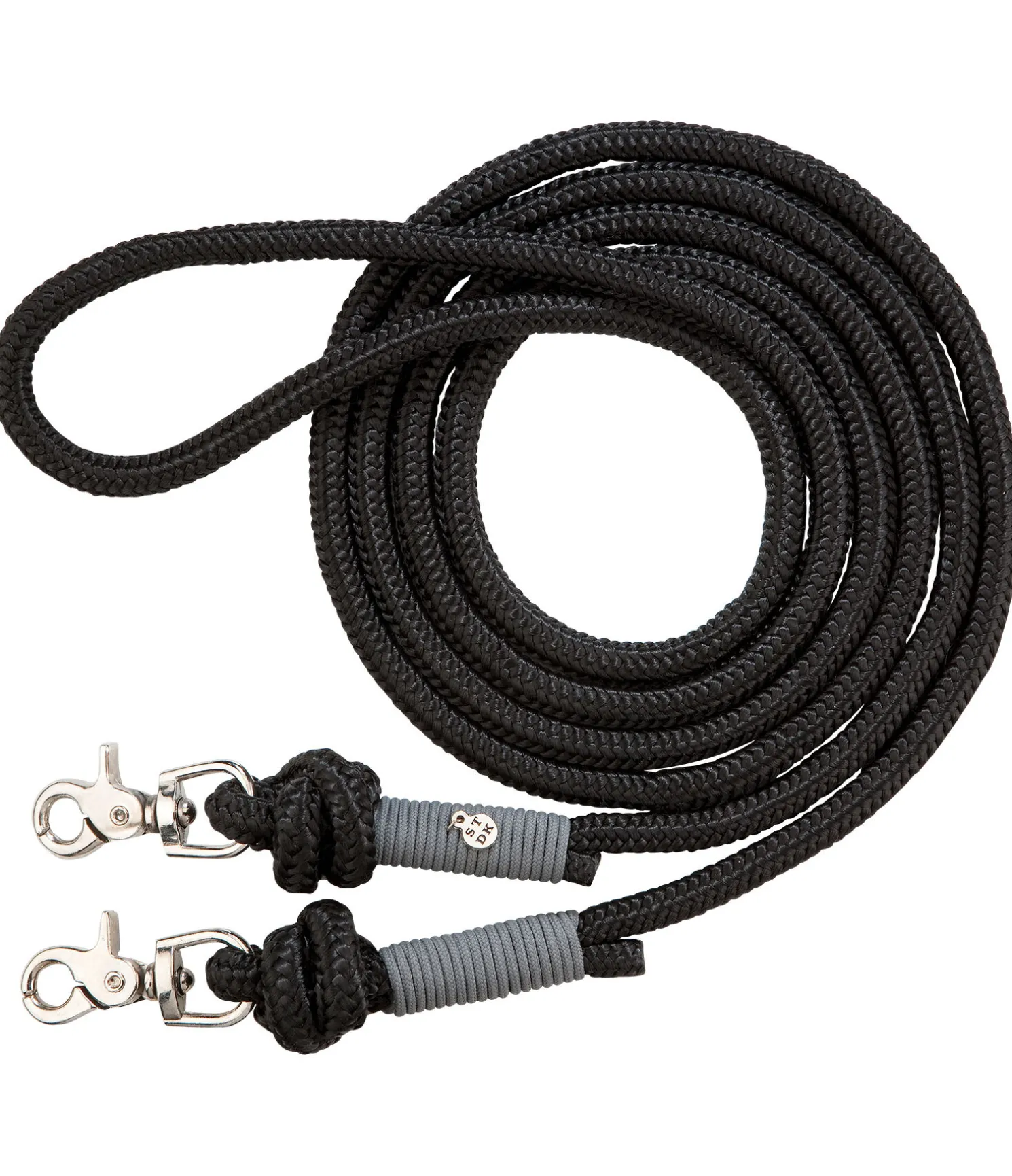 Rênes fermées particulièrement légères pour une connexion précise avec la bouche du cheval. Épaisseur 1,2 cm. Longueur (bout à bout) : 3 m. 100 % polyester.