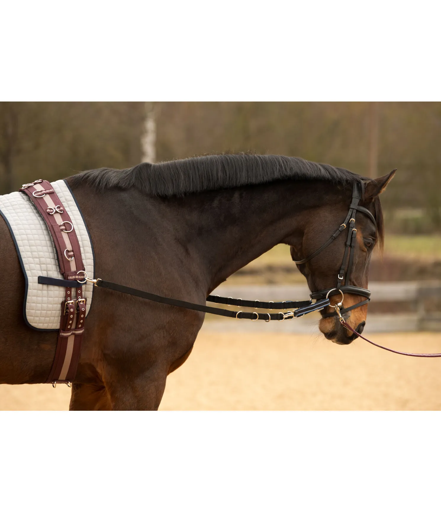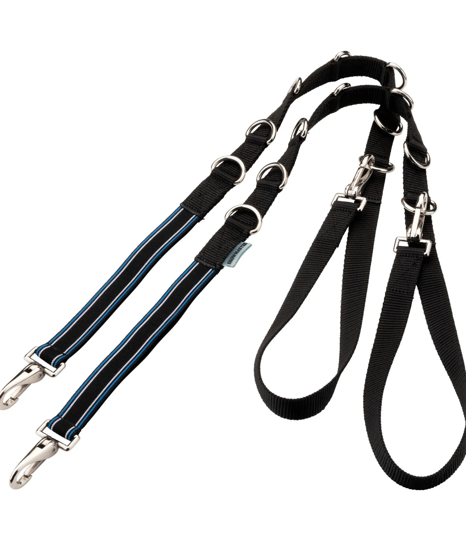 Les rênes fixes élastiquées en nylon SHOWMASTER sont idéales pour un contact souple avec la bouche du cheval : elles sont faciles à mettre en place et à ajuster grâce à des mousquetons et à de multiples anneaux en D. Parfaites pour les changements de main fréquents en longe et pour améliorer la position du cheval. 100 % nylon.