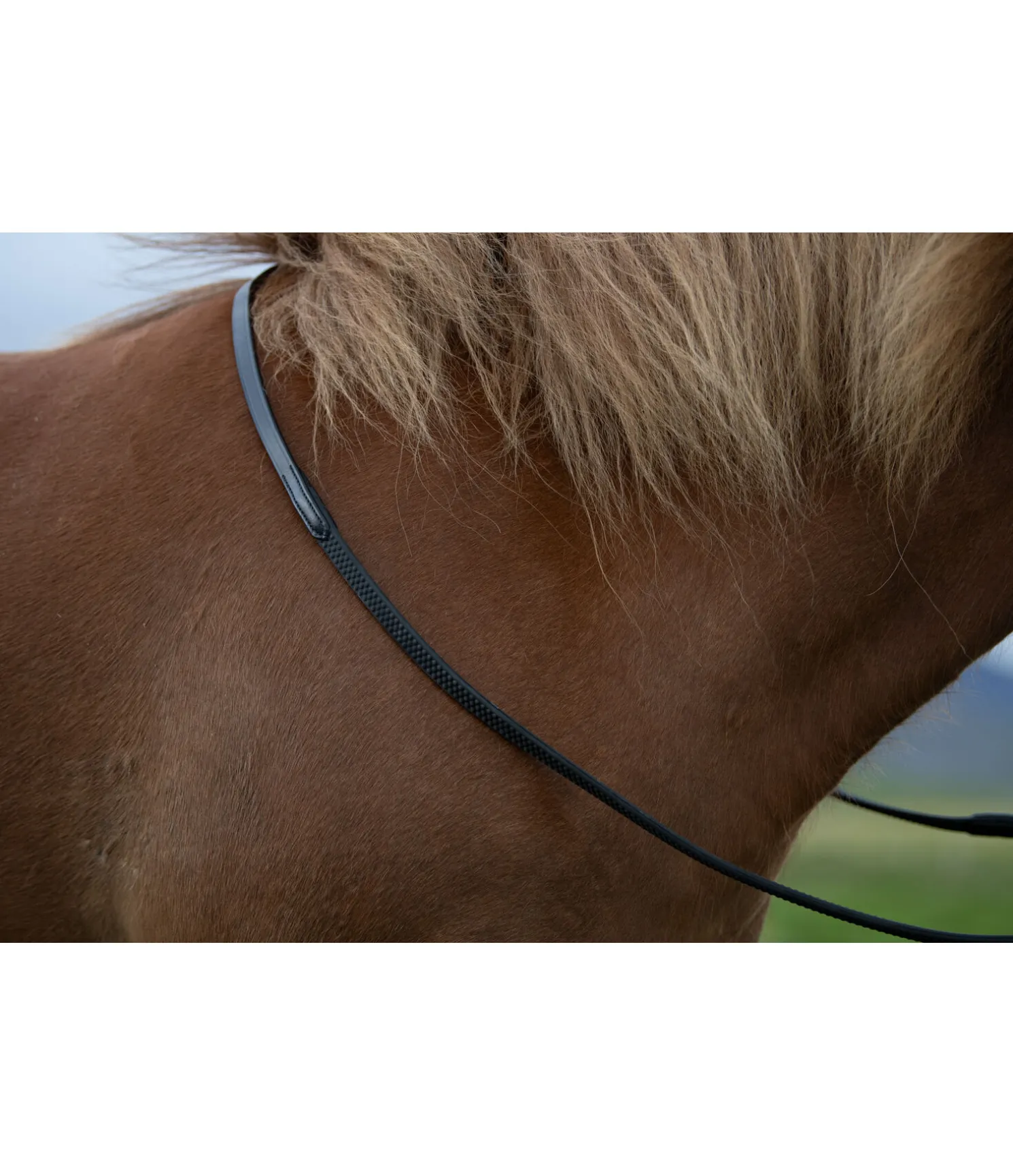 Rênes en caoutchouc avec picots pour une adhérence maximale. Les porte-mors permettent un contact doux avec le mors. Longueur 235 cm.