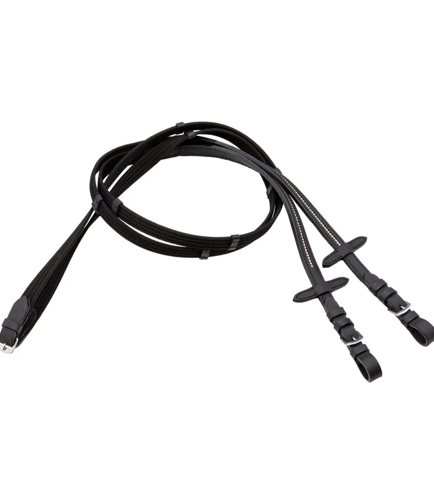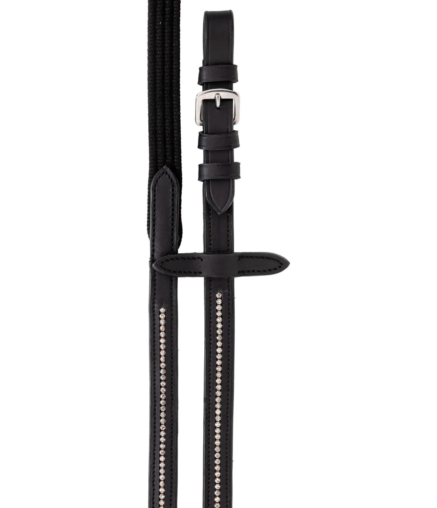 Rênes sangle en cuir avec petits strass blancs. Arrêtoirs en cuir et arrêtoirs de martingale. Cuir gras de qualité, particulièrement souple. Bouclerie argentée. Largeur : 1,9 cm. Parfaitement assorties aux autres articles de la série CLARIDGE HOUSE Mix & Match PRO. En combinant les articles de la série CLARIDGE HOUSE Mix & Match PRO, vous pouvez créer le bridon de vos rêves.