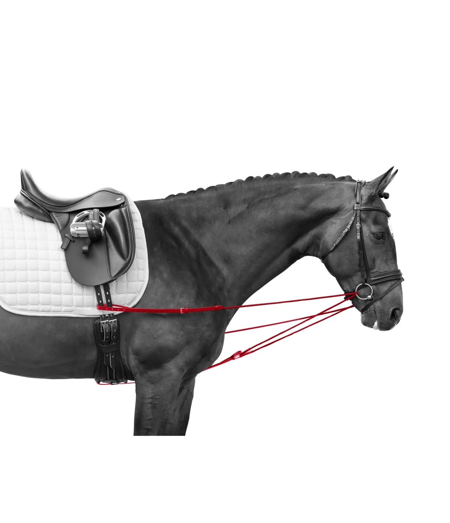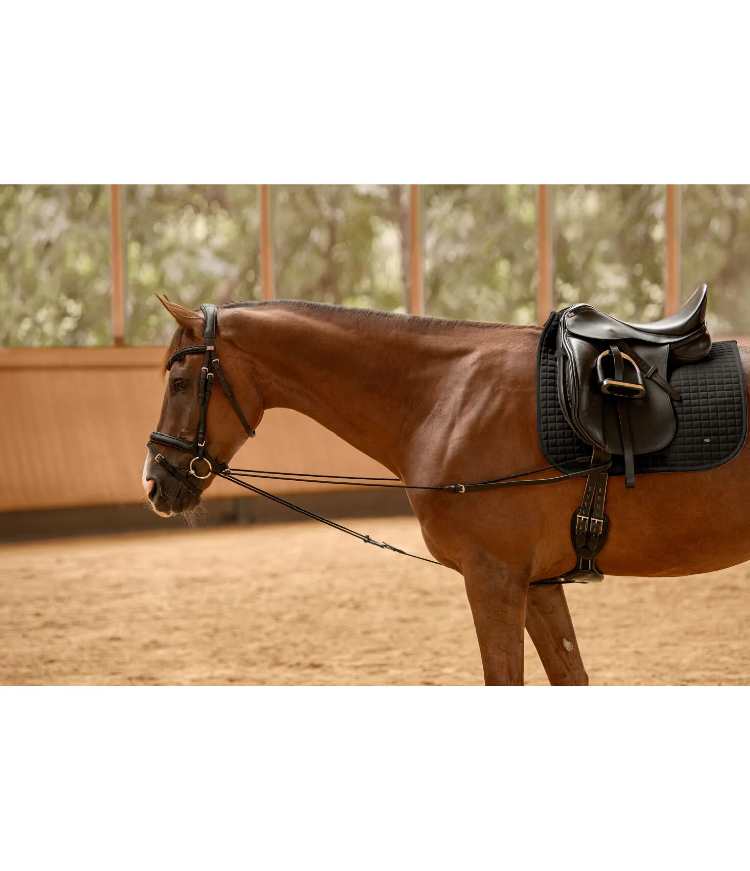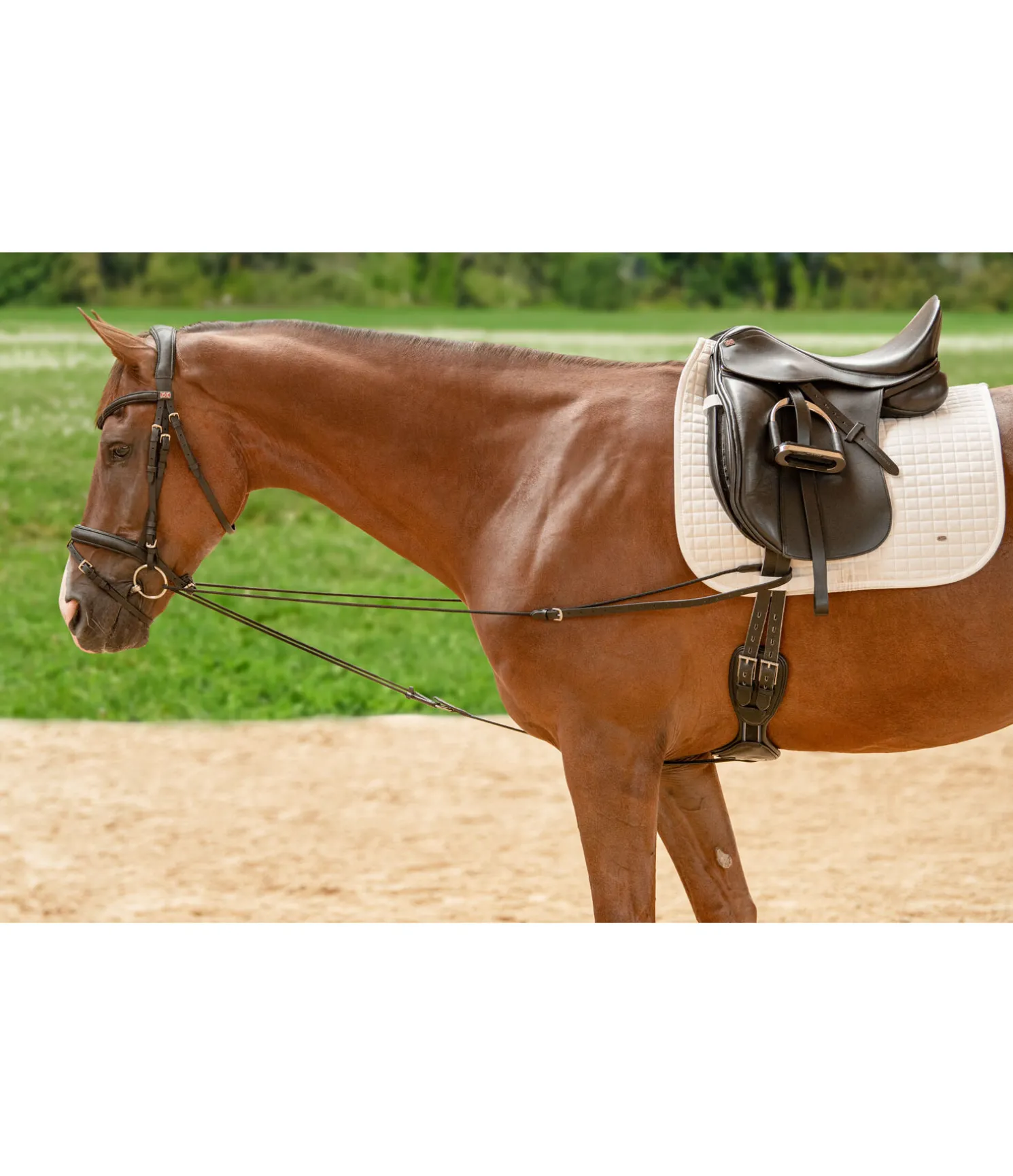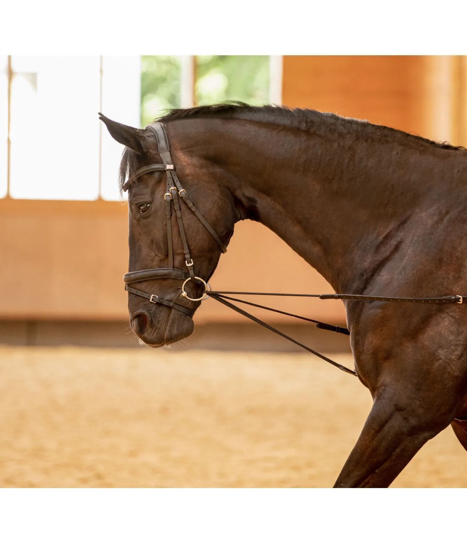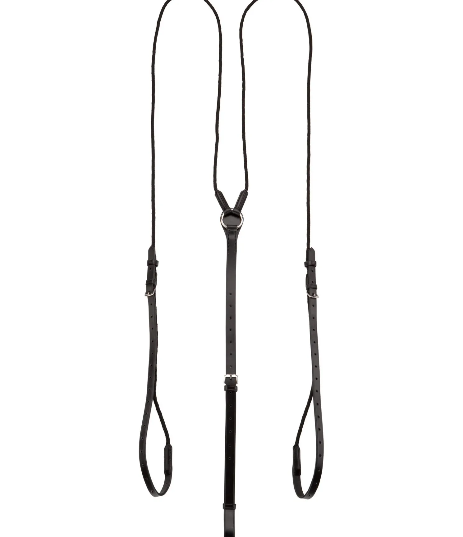 Rênes viennoises en cuir avec partie centrale des rênes en corde polyester tressée, qui permet ainsi un coulissement facile de l’enrênement dans les anneaux du mors. Taille réglable de double-poney à cheval.