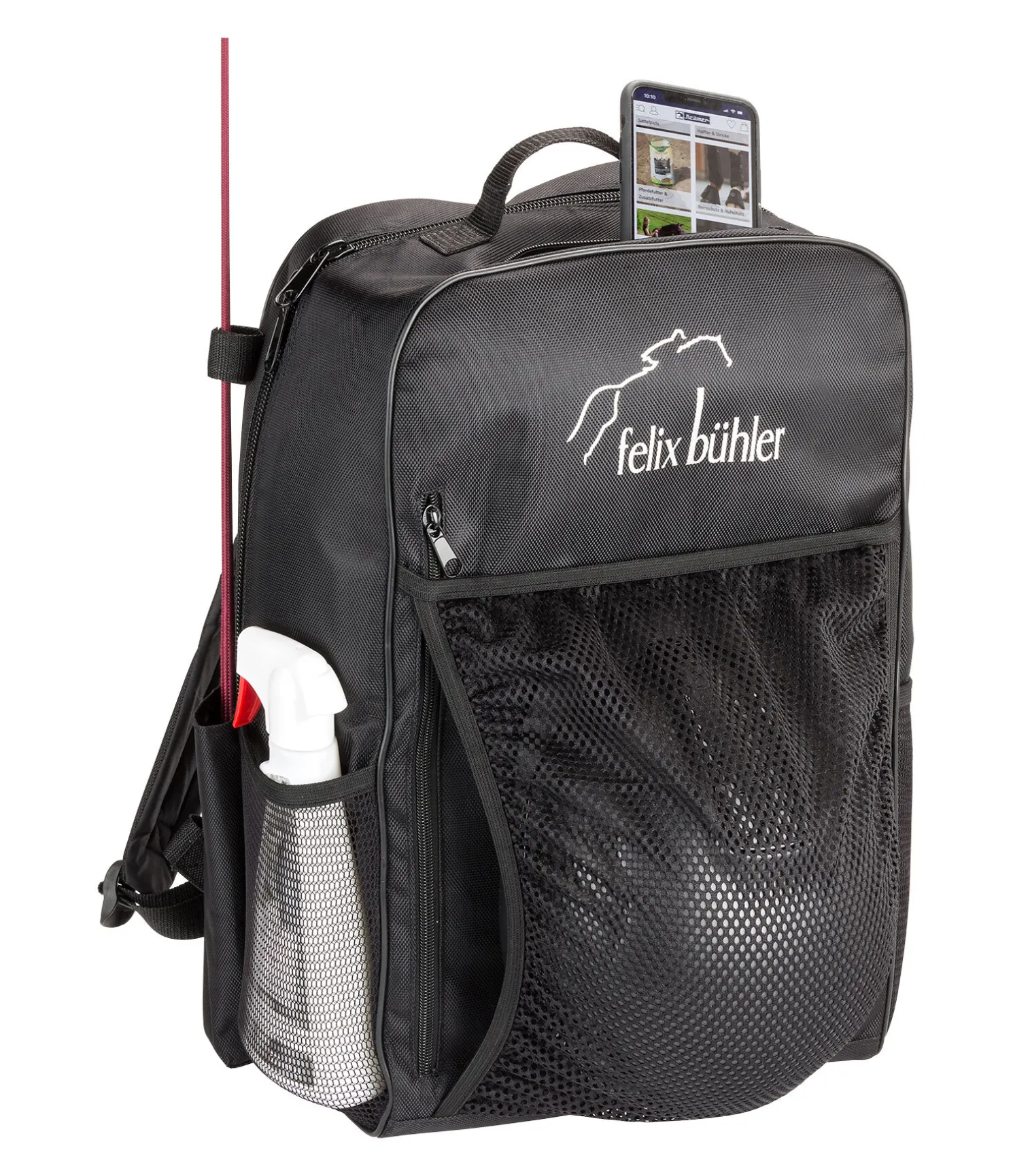 Sac à dos d’équitation pratique et élégant avec compartiment extérieur pour le casque. Conçu en nylon robuste. Doté de deux poches latérales extensibles pour ranger facilement des bouteilles d’eau ou des produits de soin, d’une poche rembourrée pour smartphone et d’un petit compartiment latéral pour ranger la cravache. Grande poche zippée pour stocker un gilet ou autre. Grand compartiment intérieur avec espace de rangement pour la protection dorsale avec fermeture par patte auto-agrippante. Possibilité de ranger une paire de bottes d’équitation jusqu’à 38 cm (sac taille M) ou 50 cm (sac taille L). Bretelles rembourrées et réglables en longueur. Poignée de transport. Dimensions taille L : 35 x 52 x 17 cm – Dimensions taille M : 30 x 40 x 13 cm.