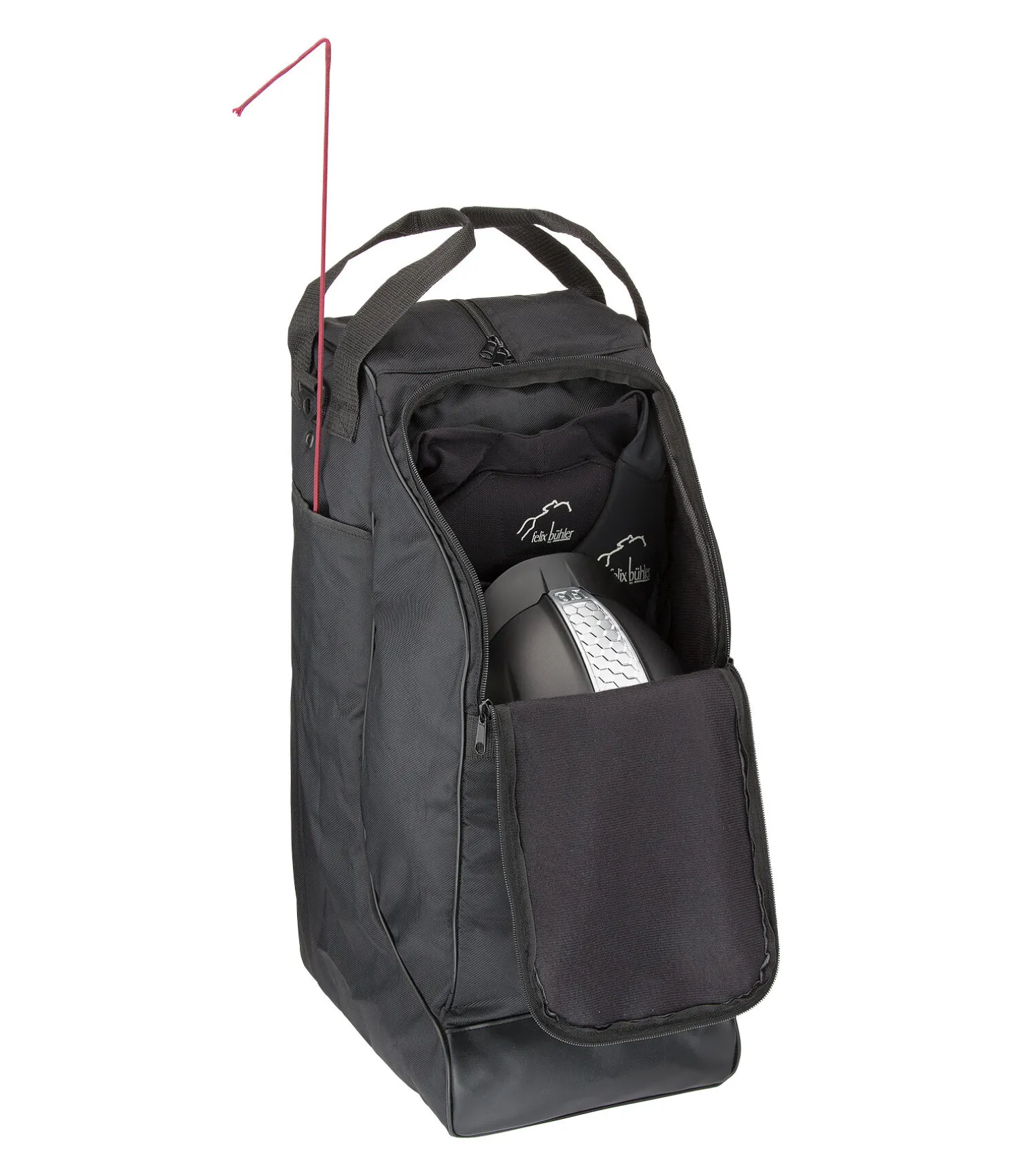 Sac à dos pour l’équitation en nylon résistant avec poche à l’avant rembourrée pour le casque d’équitation et la protection dorsale. Large compartiment pour les bottes d’équitation avec trous d’aération, petit compartiment pour les gants, les éperons, etc. ainsi qu’un compartiment plus long pour les cravaches. Le sac dispose d’une longue bandoulière et d’anses en plus de ses bretelles rembourrées réglables. Points d’appui en caoutchouc sur le dessous pour éviter une usure prématurée. 35 x 60 x 25 cm.