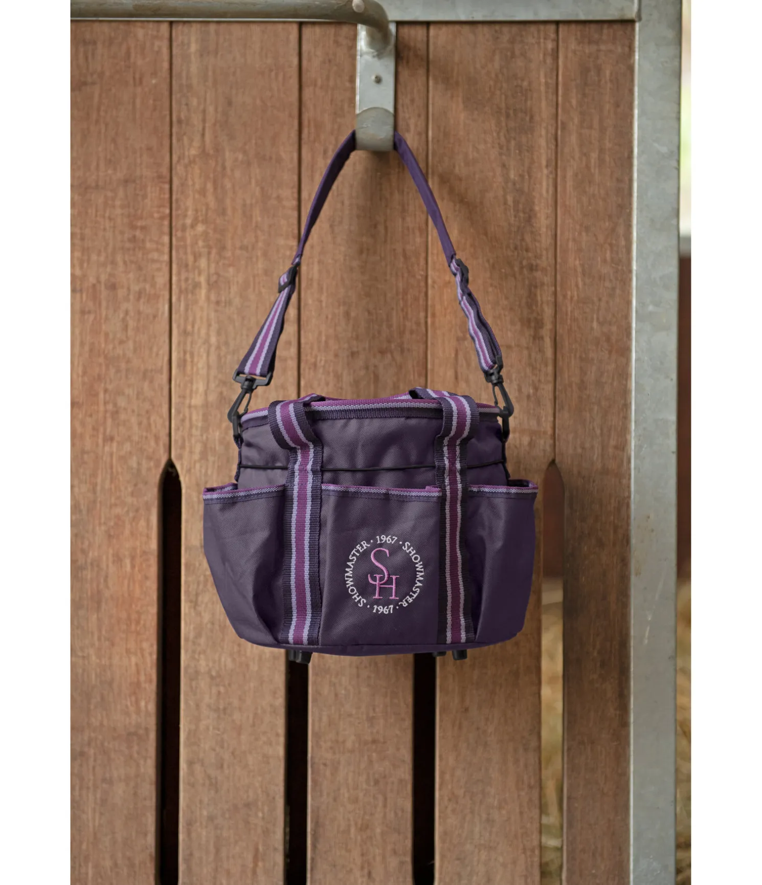 Sac de pansage au look sportif confectionné dans une matière anti-salissures. Avec 6 poches extérieures, 2 anses et une bandoulière amovible. Refermable par le haut au moyen d’un cordon de serrage. 28 x 18 x 25 cm.