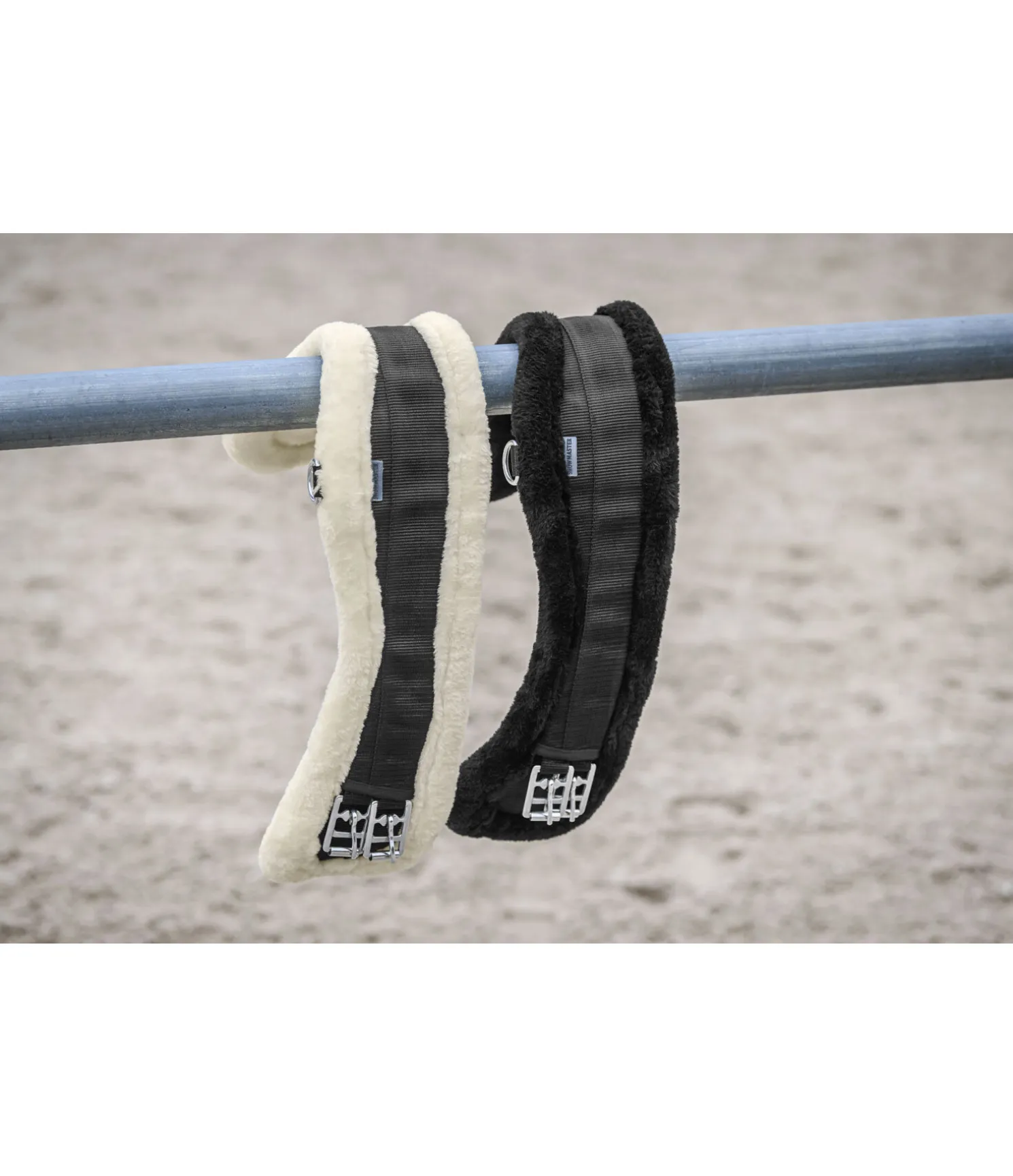 Sangle de dressage de forme anatomique. Empiècements élastiqués à chaque extrémité. Anneau en D central et boucles à rouleau. Doublure en polaire Teddy extra douce pour éviter les irritations dues aux frottements. Largeur de la sangle simple 11 cm – avec polaire 15 cm.