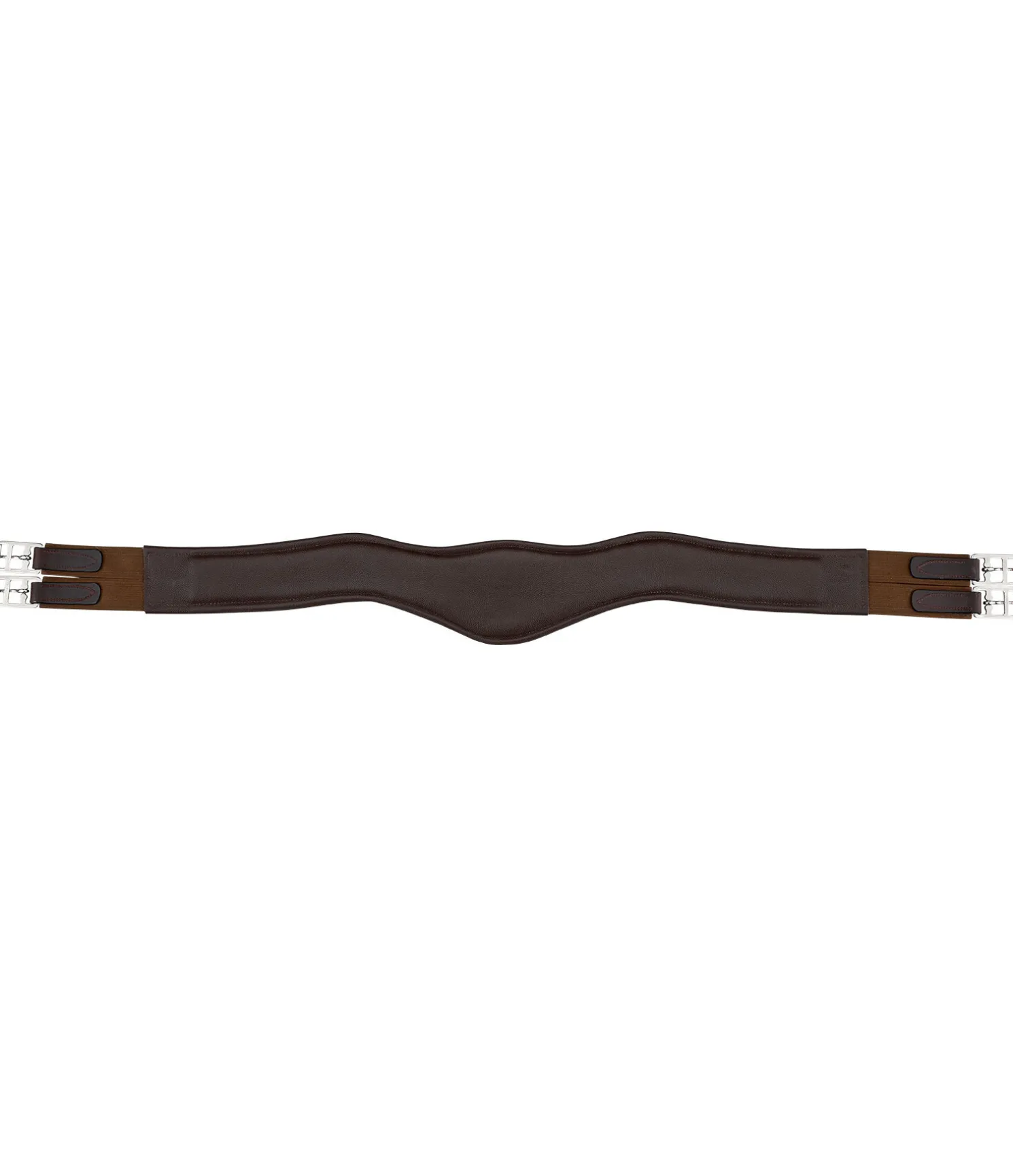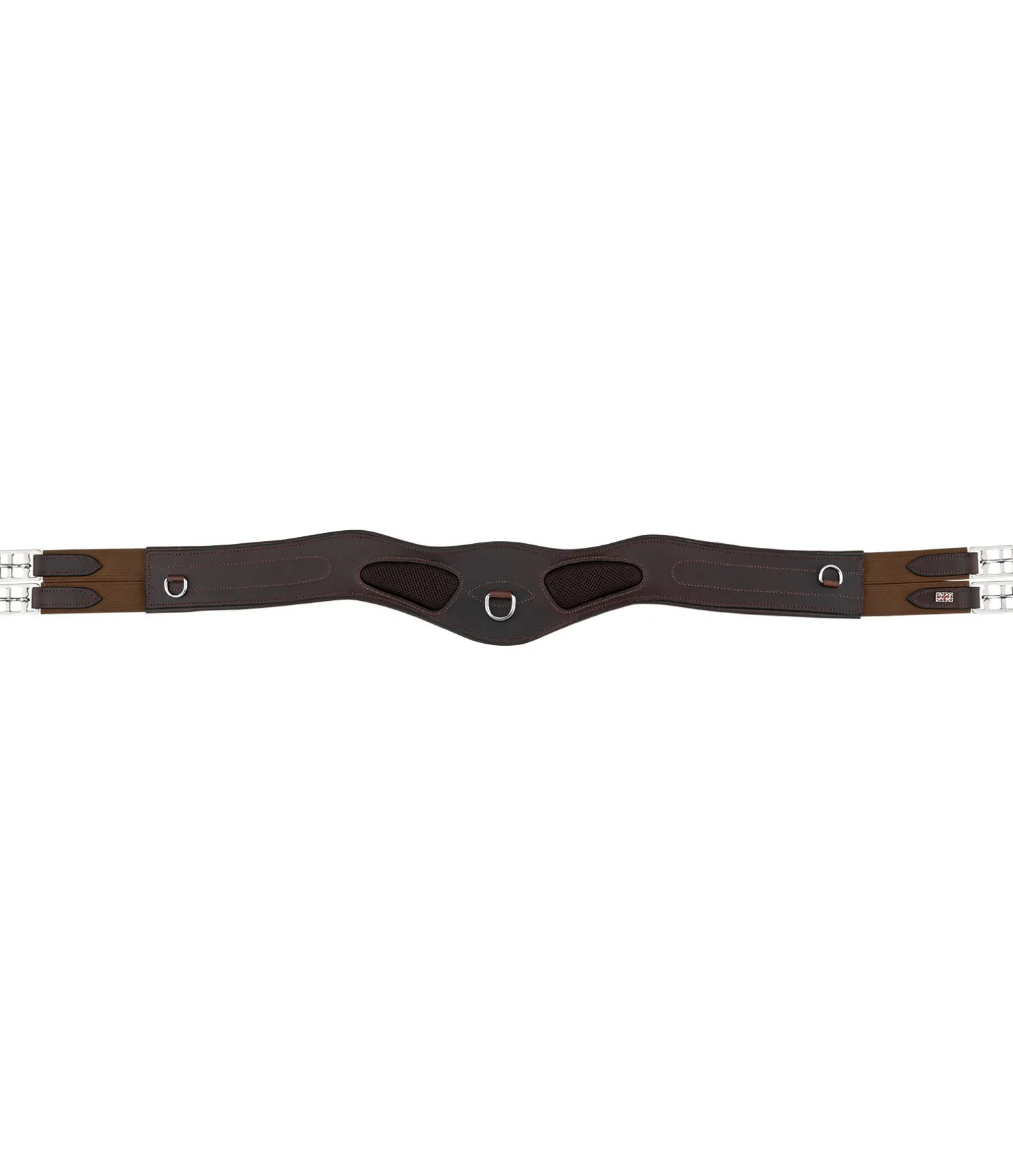 Sangle en cuir anatomique avec doublure douce. Trois anneaux en D, empiècements élastiqués des deux côtés et boucles à rouleau. Largeur de la sangle 8,5 à 13 cm.