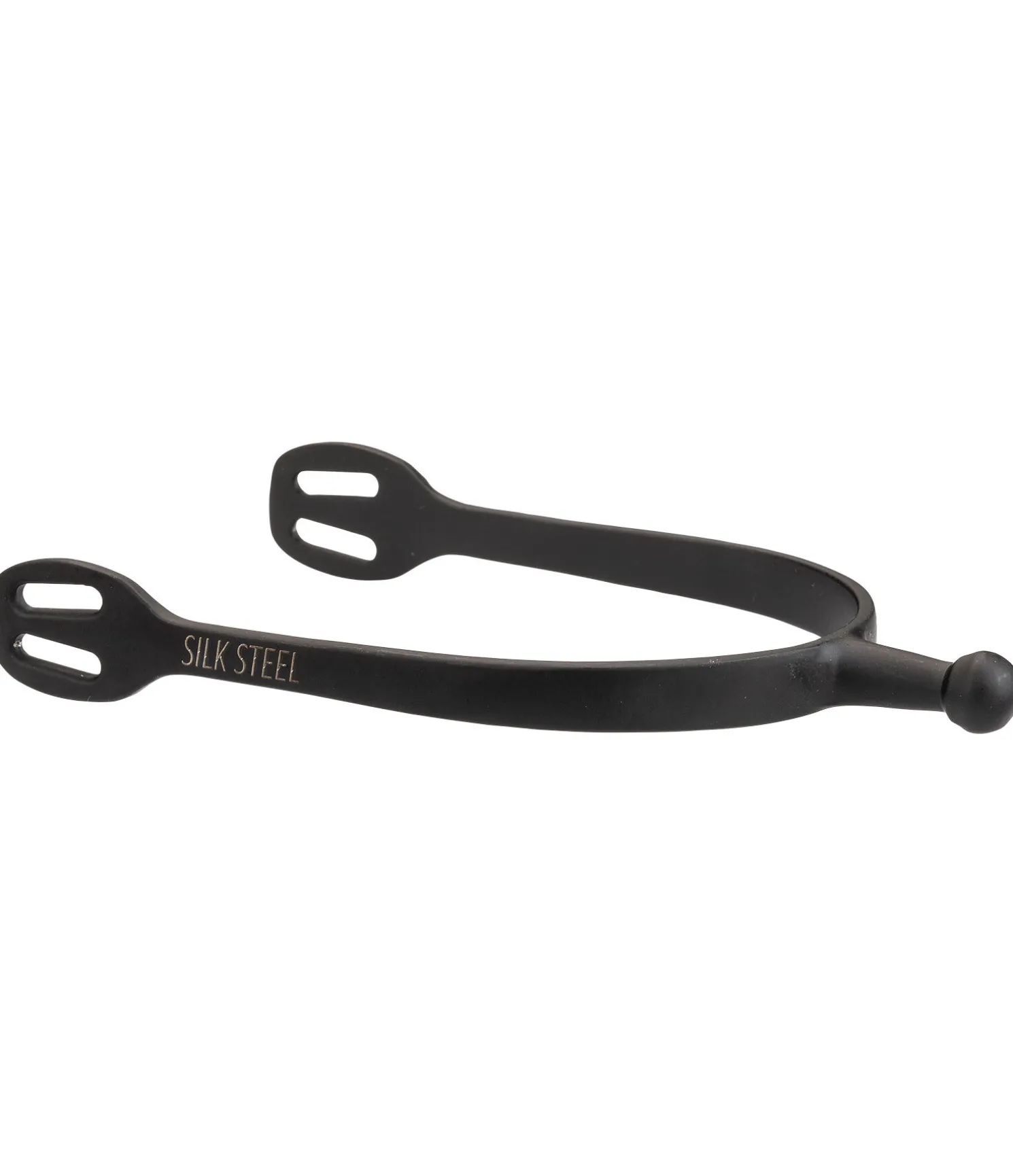 Éperons à bout rond noirs mats en acier inoyxdable. Logo SILK STEEL gravé. Forme améliorée des oeillets facilitant le passage des lanières. Taille de la tige 25 mm.