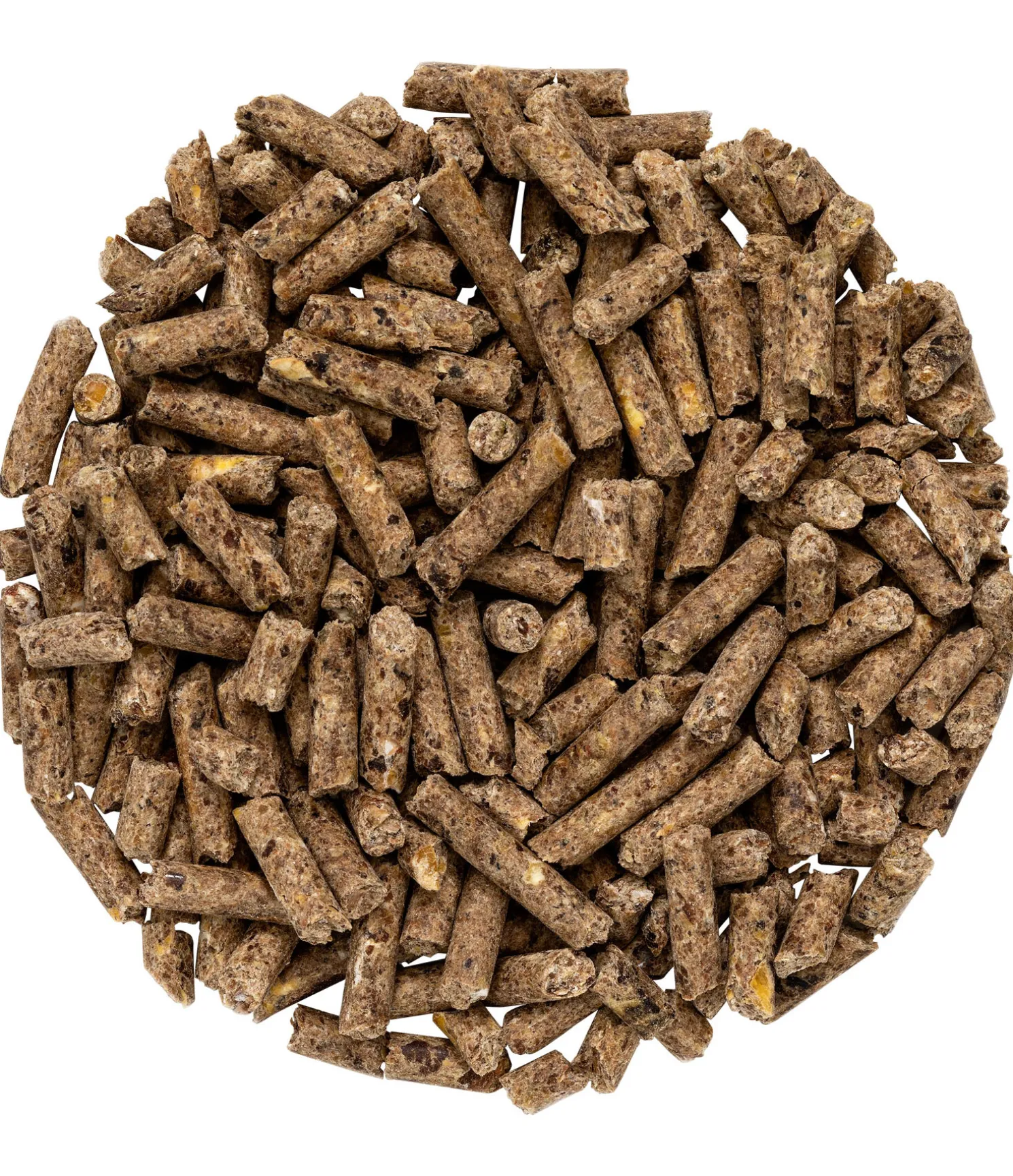 Composition : Tourteau de lin, maïs, farine de blé, dextrose, germes de malt, son de blé, marc de pomme, levures (inactivées), mélasse de betterave, carbonate de calcium, chlorure de sodium, huile de soja (brute).