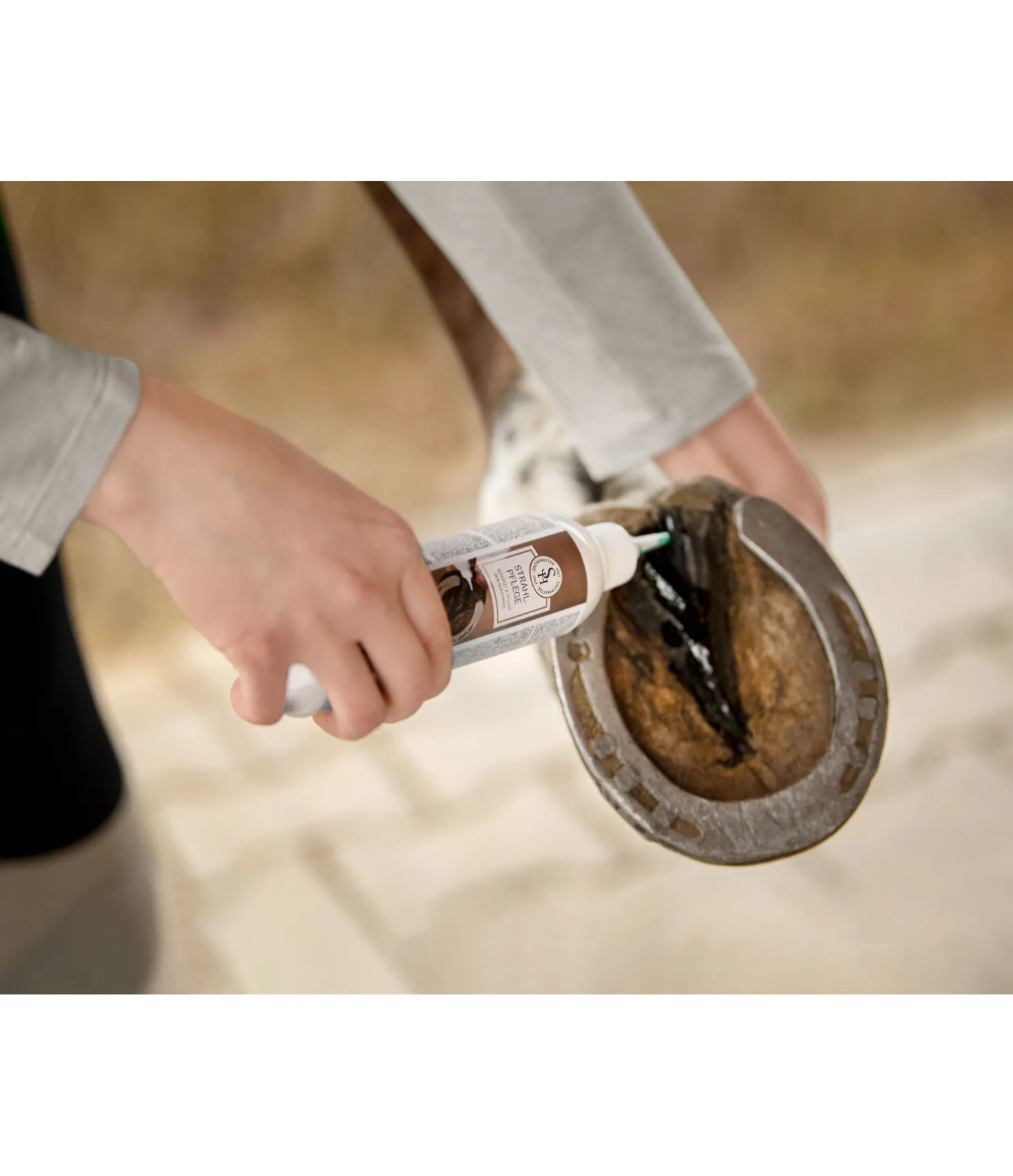 Application : Bien agiter avant utilisation! Nettoyer en profondeur la fourchette et le sabot puis appliquer le produit. Appliquer une à trois fois par semaine selon nécessité.