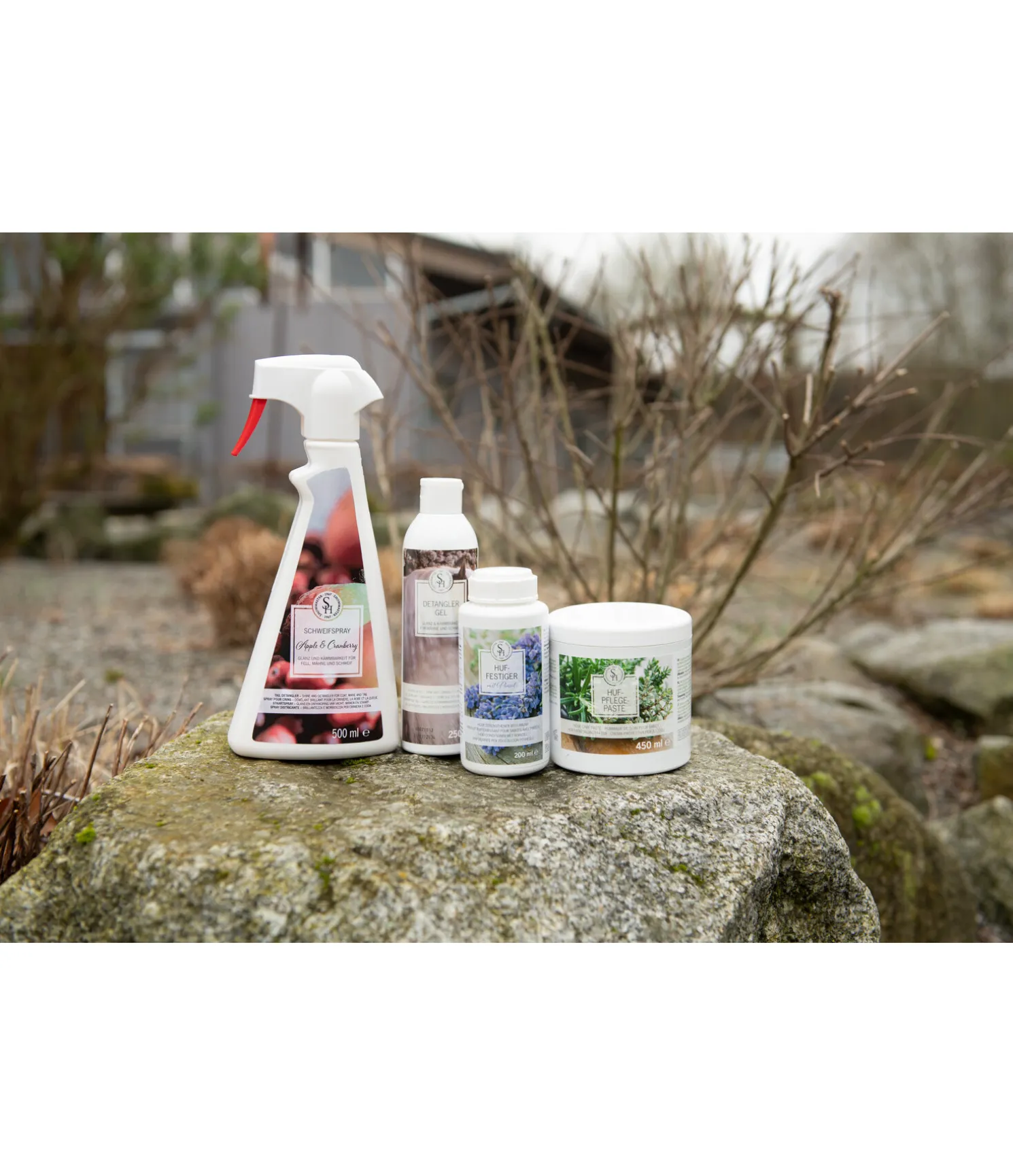 Spray pour le soin des crins de la queue, de la crinière et de la robe au parfum hivernal de pomme et de cranberry. Pour un démêlage facile et rapide des crins et une robe soyeuse et douce, protégée de la poussière. Pendant toute la durée d’action du produit, la queue, la crinière et la robe du cheval restent brillantes et soignées. Les taches d’urine ou d’herbe et les traces de sueur séchées s’éliminent facilement en un coup de brosse.