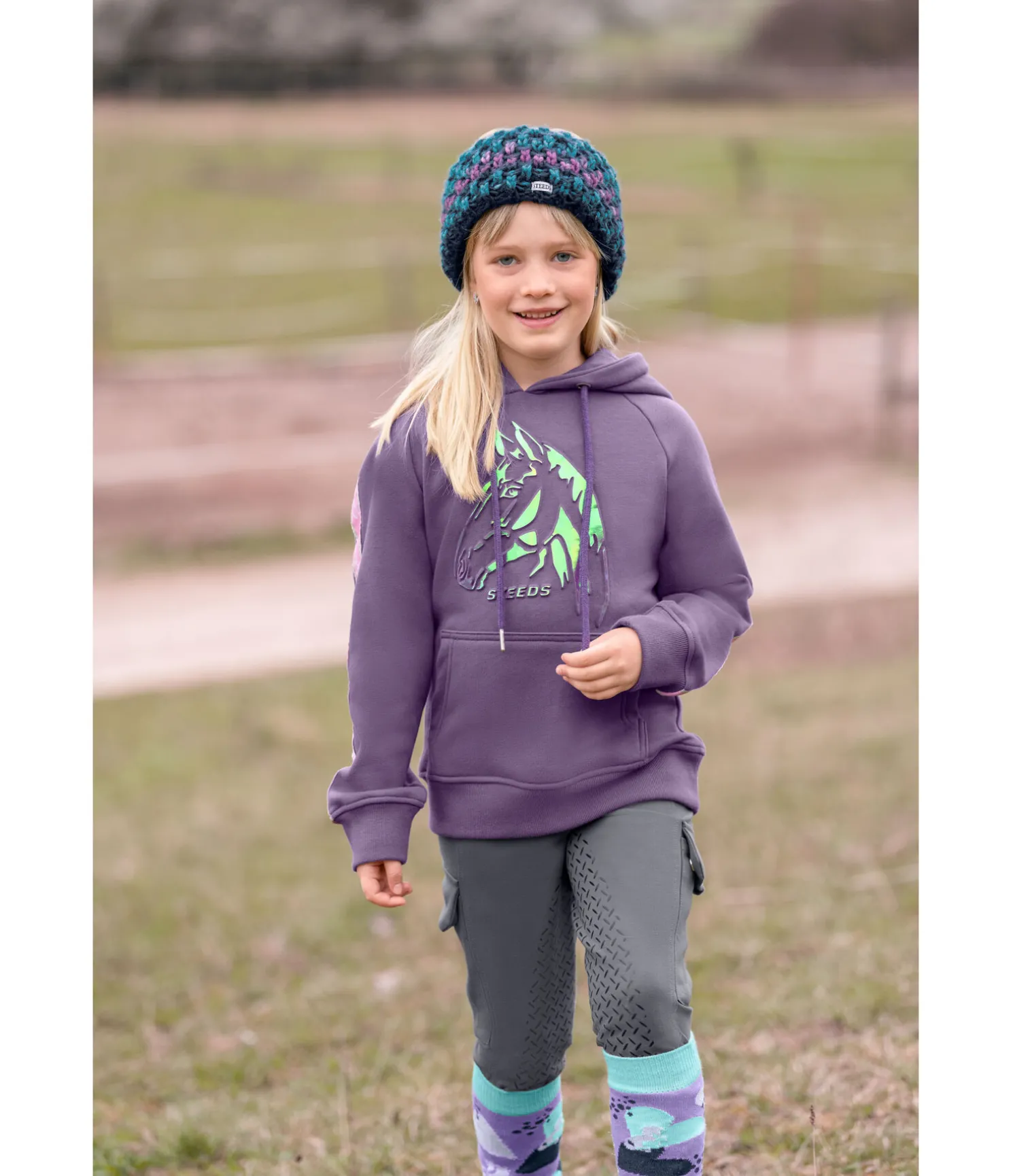 Sweat à capuche avec imprimé cheval en relief scintillant dans les couleurs de l’arc-en-ciel. Insert sur les manches de couleur contrastante avec logo et bord scintillant. Intérieur molletonné doux. Capuche réglable par cordon de serrage. Poche kangourou. Finition en bord-côte sur le bas des manches et l’ourlet. 65 % polyester, 35 % coton.