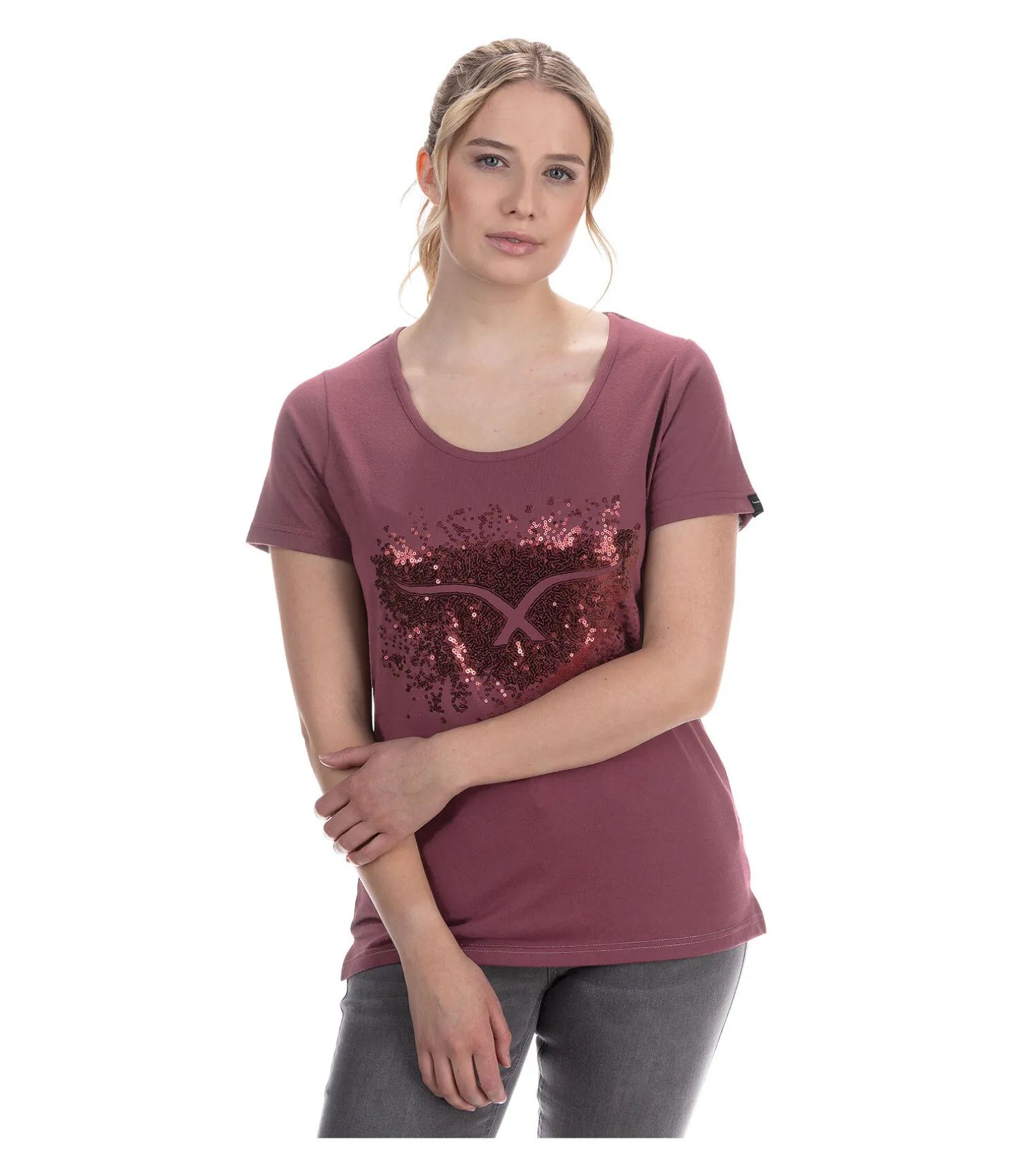 T-shirt à col rond. Matière respirante. Motif pailleté sur la poitrine. 65 % polyester, 35 % coton.