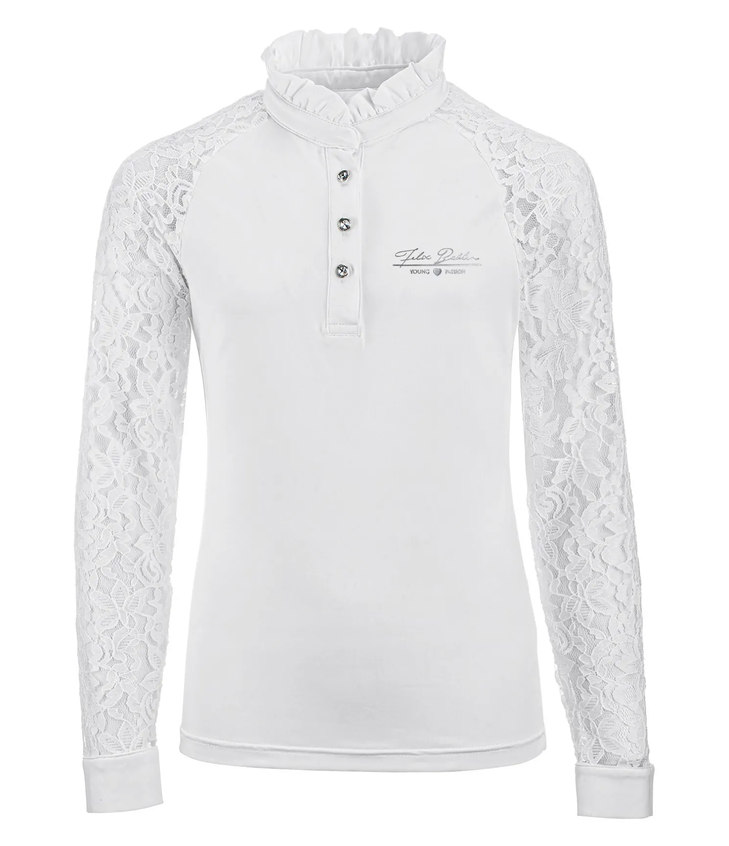 Élégant T-shirt de concours à manches longues en dentelle douce avec col à volants et boutons à strass. Respirant et à séchage rapide. 88 % polyester, 12 % élasthanne. Remarque : lavage à la main ou dans un sac de lavage recommandé.