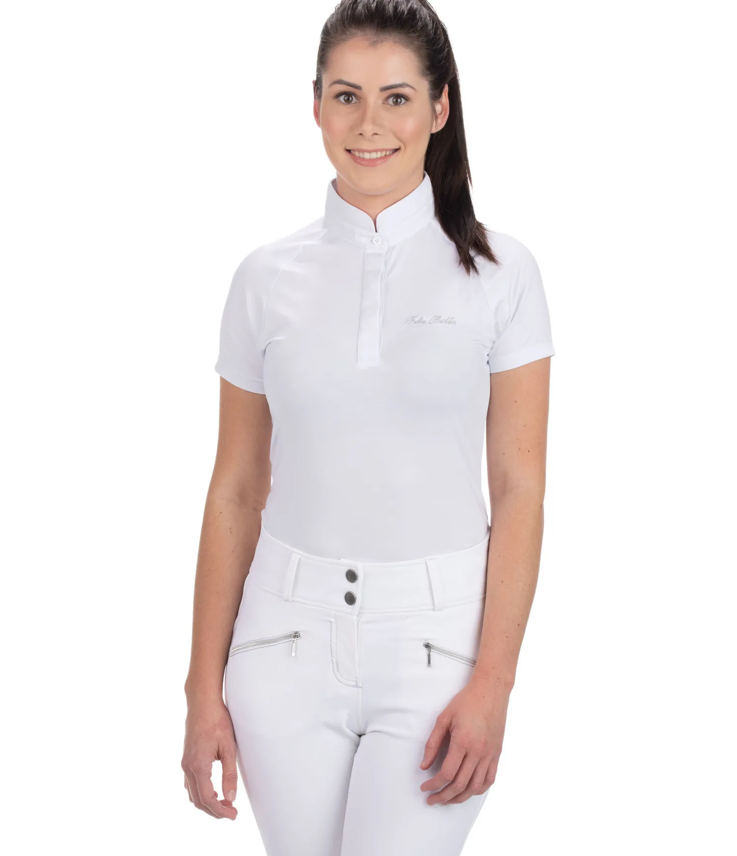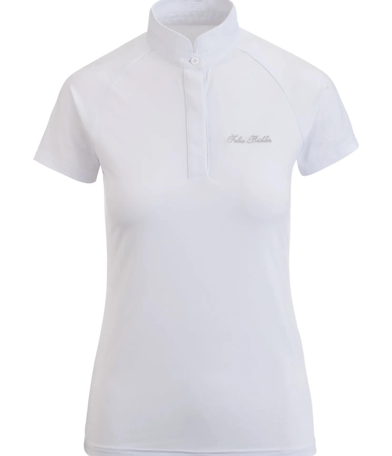 Élégant T-shirt de compétition technique. Patte de boutonnage discrète. Col officier. Dos en dentelle. Matière très extensible, respirante et à séchage rapide. Broderie Felix Bühler argentée sur la poitrine. 88 % polyester, 12 % élasthanne; dentelle 93 % nylon, 7 % élasthanne.
