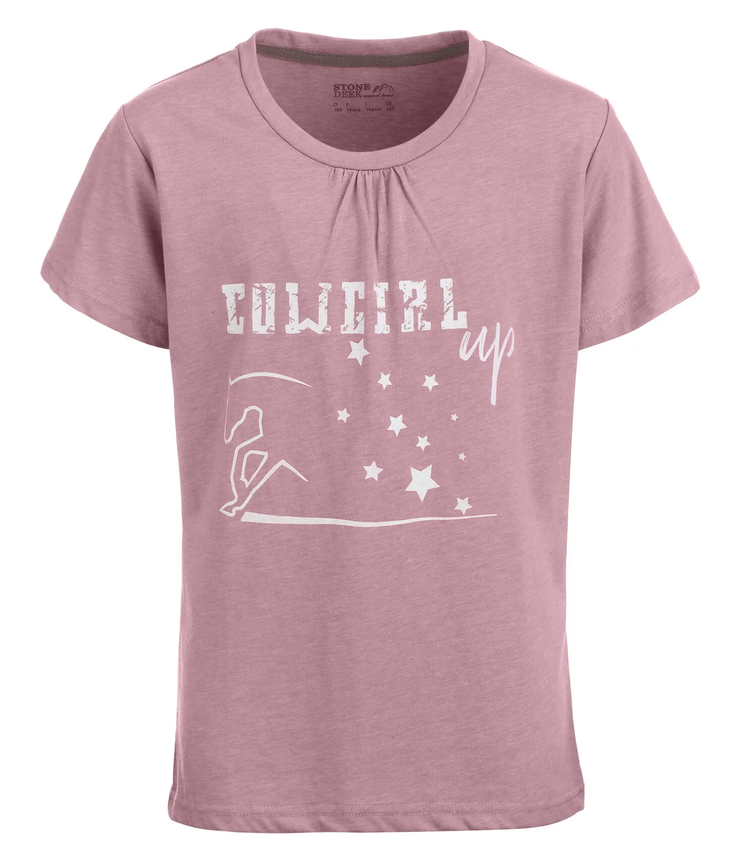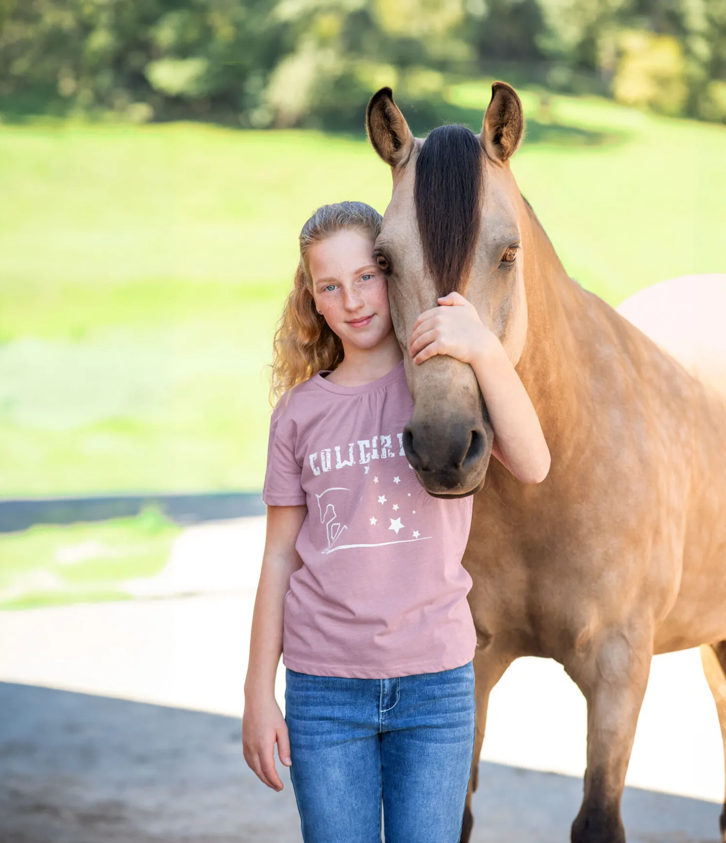T-shirt pour vraies cow-girls avec plissé au col et superbe motif pailleté sur la poitrine. 65 % polyester, 35 % coton.